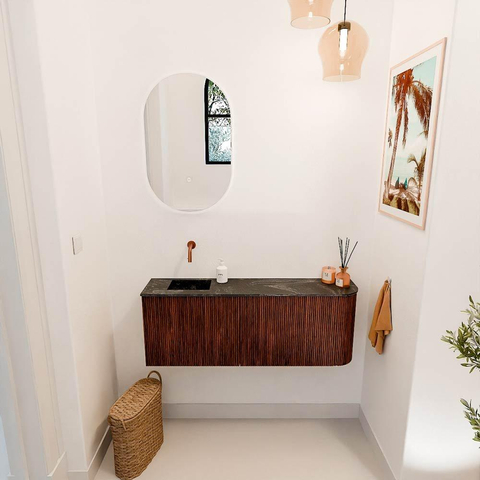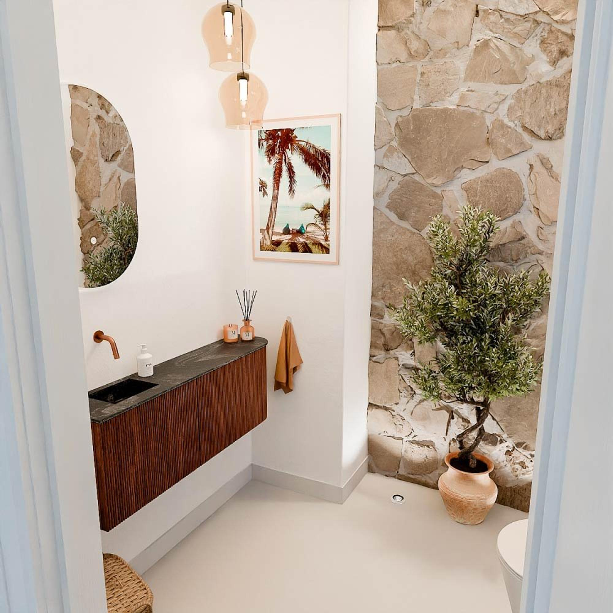 Avec ce magnifique meuble, vous donnez immédiatement à votre salle de bains ou toilettes d'invités un aspect élégant et chaleureux. Il combine un arrondi droit saisissant avec une couleur rubis profonde qui attire immédiatement le regard. L'association avec la vasque couleur Lava crée un contraste subtil qui rend l'espace vivant sans dominer. Grâce à la conception intelligente avec une vasque à gauche et sans trou de robinet, vous pouvez choisir vous-même quel robinet convient le mieux à votre style et à votre usage. Ce meuble est non seulement un plaisir pour les yeux, mais aussi étonnamment pratique : il offre suffisamment d'espace de rangement pour garder votre salle de bains propre et ordonnée. Vous profitez ainsi chaque jour d'un espace rangé et chaleureux où vous aimez passer du temps.