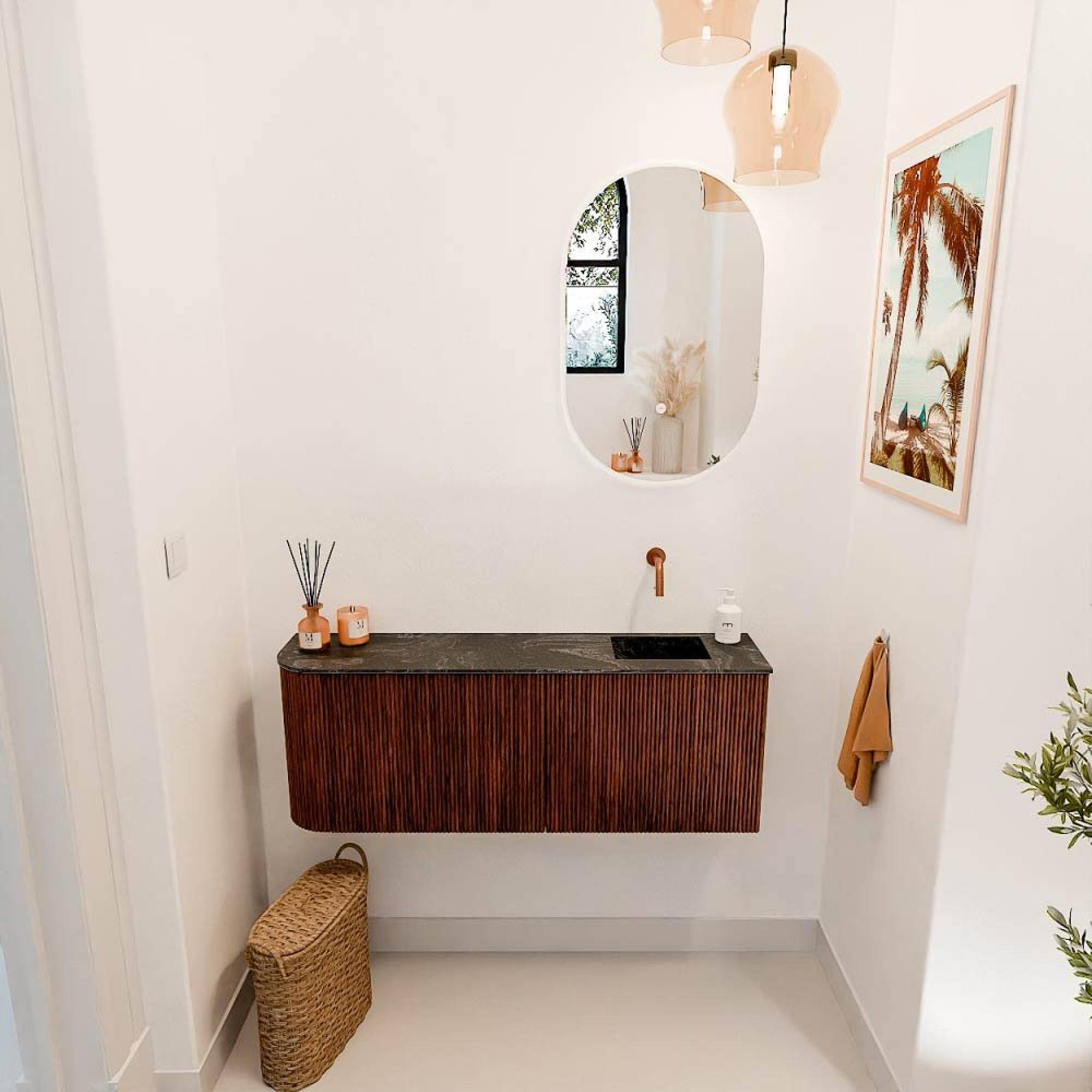 Avec ce magnifique meuble, vous donnez à votre salle de bains une apparence unique et chaleureuse. Il combine une forme arrondie à gauche remarquable avec une couleur Ruby profonde et riche qui attire immédiatement l'attention. La vasque, réalisée en couleur Lava et fabriquée en Corian de haute qualité, ajoute une touche moderne et épurée. Grâce au positionnement astucieux de la vasque à droite, vous optimisez l'espace, tandis que l'absence de trou de robinet vous donne la liberté de choisir vous-même un robinet. Ce meuble est non seulement un plaisir pour les yeux, mais aussi extrêmement pratique. Les façades en chêne massif dégagent une qualité et créent une atmosphère naturelle, tandis que les côtés en placage chêne apportent une finition raffinée. En fixant le meuble au mur, vous créez un effet d'espace et gardez le sol libre, ce qui donne à la salle de bains une apparence fraîche et ouverte. Ainsi, vous transformez votre salle de bains en un espace élégant et fonctionnel où vous prenez plaisir à séjourner chaque jour.