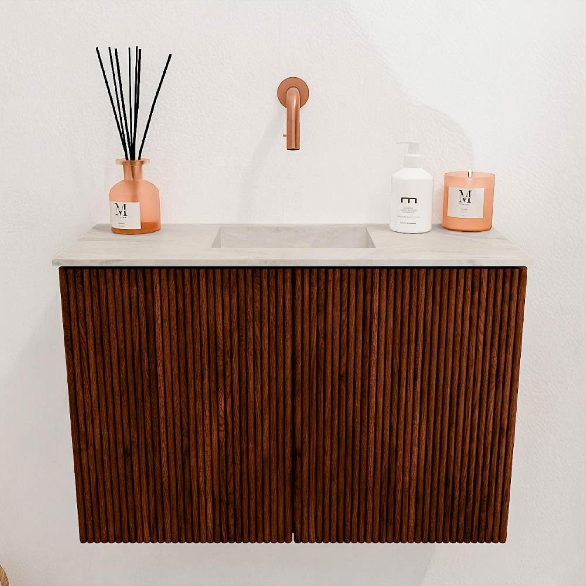 Avec une largeur de 60 cm et une profondeur de 24,5 cm, ce meuble est idéal pour les petits espaces où vous ne souhaitez pas renoncer au rangement et à la facilité d'utilisation. La vasque est placée au centre et sans trou de robinet, vous permettant de choisir vous-même le robinet qui correspond le mieux à votre style et à vos souhaits. Le meuble est suspendu au mur, ce qui crée un effet d'espace et facilite le nettoyage du sol. De plus, le meuble offre suffisamment d'espace pour ranger proprement les articles de toilette, ce qui permet de garder votre salle de bains toujours ordonnée et organisée. Vous combinez ainsi facilement style et avantages pratiques.