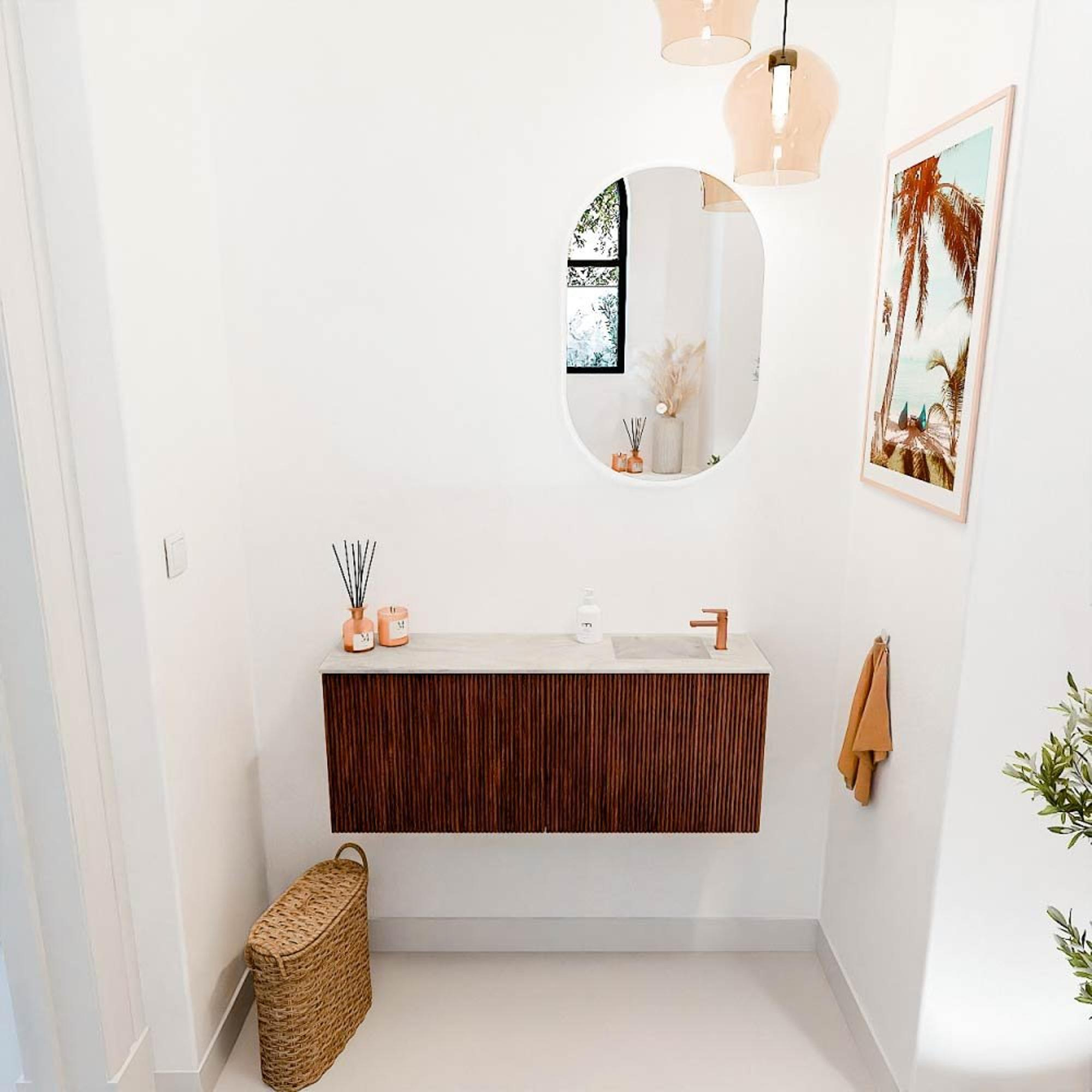 Le meuble se distingue immédiatement par sa couleur Ruby élégante, qui ajoute chaleur et caractère à votre salle de bains. La structure à rainures verticales sur les portes donne à l'ensemble une apparence moderne mais néanmoins intemporelle. Cette combinaison fait du meuble un véritable point focal, sans dominer. La vasque de couleur Ostra s'harmonise parfaitement et apporte une touche fraîche et lumineuse. Ainsi, vous créez un équilibre harmonieux entre couleur et forme, qui donne à votre salle de bains une apparence personnelle et luxueuse.