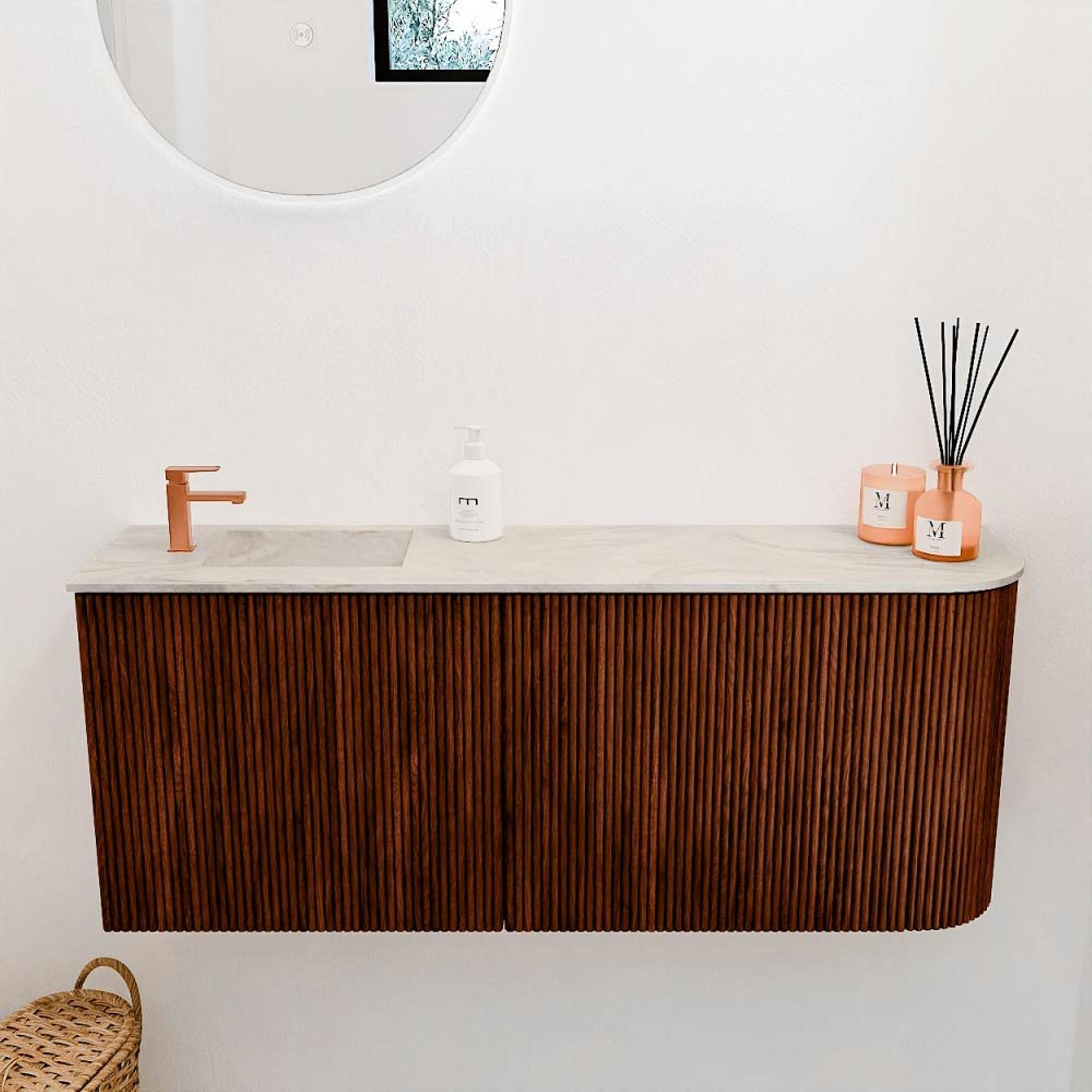 Ce meuble attire immédiatement l'attention par sa couleur Ruby élégante et l'aspect chaleureux du chêne massif. La combinaison avec le lavabo Ostra crée un contraste subtil qui dégage calme et classe. Grâce au côté droit arrondi, le meuble acquiert un caractère unique et ludique, ce qui en fait un véritable point focal dans votre salle de bains. Le design est moderne et intemporel, ce qui le rend parfait pour différents styles d'intérieur. Vous créez ainsi facilement une salle de bains à la fois élégante et personnelle.Durable
