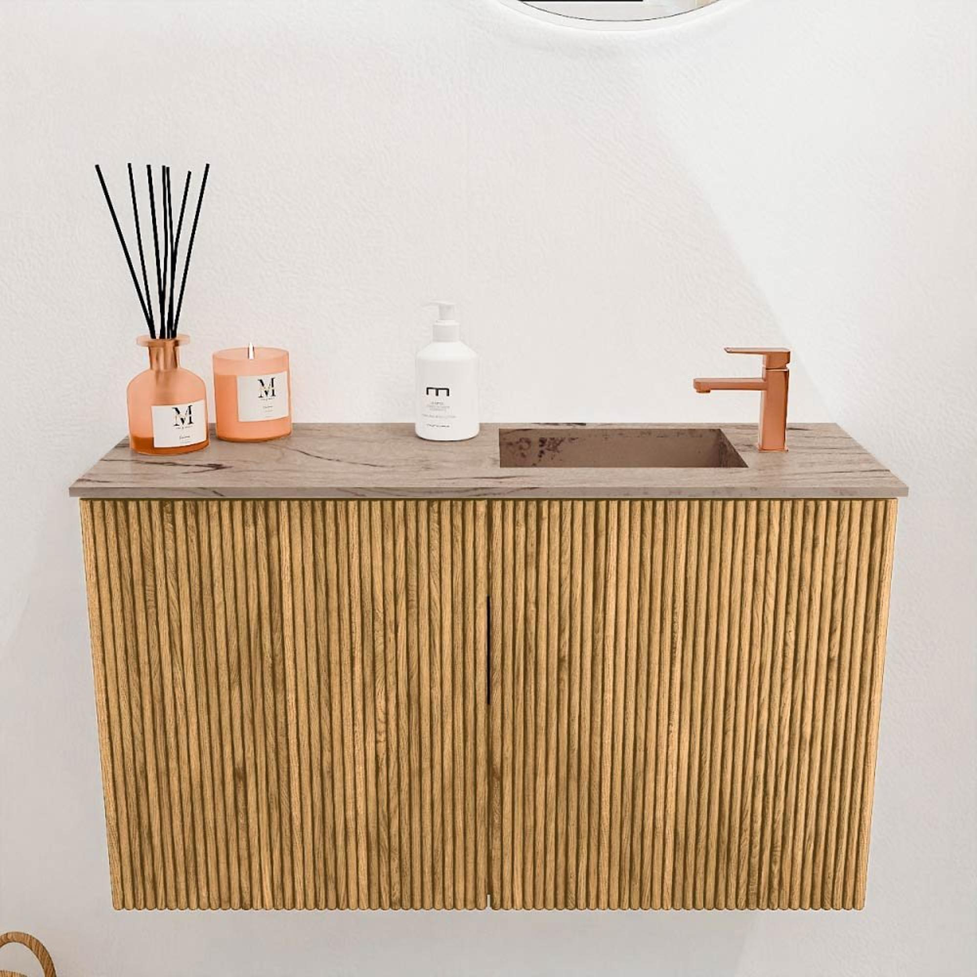 La couleur chaude chêne et les détails de rainures verticales donnent à ce meuble une apparence intemporelle et naturelle qui s'intègre facilement dans différents styles de salle de bains. Que vous aimiez le moderne, le rustique ou l'industriel, ce meuble ajoute toujours une touche d'élégance. La couleur arena de la vasque crée un contraste subtil qui donne encore plus de caractère à l'ensemble. Grâce à cette combinaison réfléchie de couleurs et de matériaux, vous créez une salle de bains qui n'est pas seulement fonctionnelle, mais invite aussi à la détente et au plaisir.