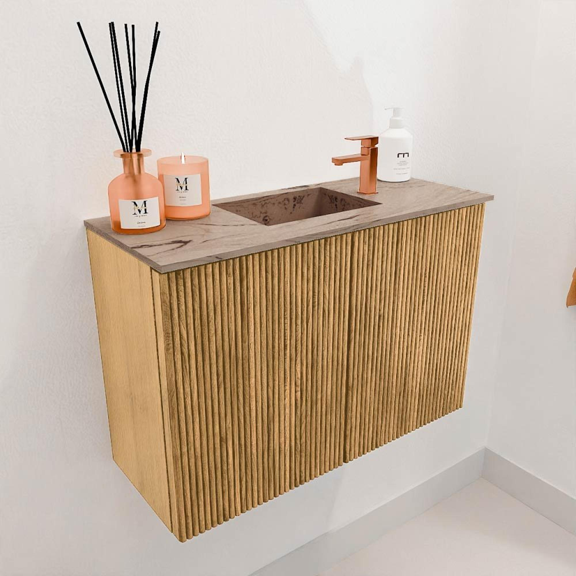 Le meuble se distingue immédiatement par son élégant aspect chêne naturel avec des rainures verticales qui donnent au design une texture subtile mais distinctive. Cette finition élégante permet au meuble de s'adapter facilement à divers styles d'intérieur, du moderne épuré au chaleureux rustique. Grâce à la couleur chaude et au matériau naturel, votre salle de bains paraît immédiatement accueillante et authentique. Vous créez ainsi une atmosphère qui dégage calme et confort, exactement ce que vous recherchez dans une salle de bains.