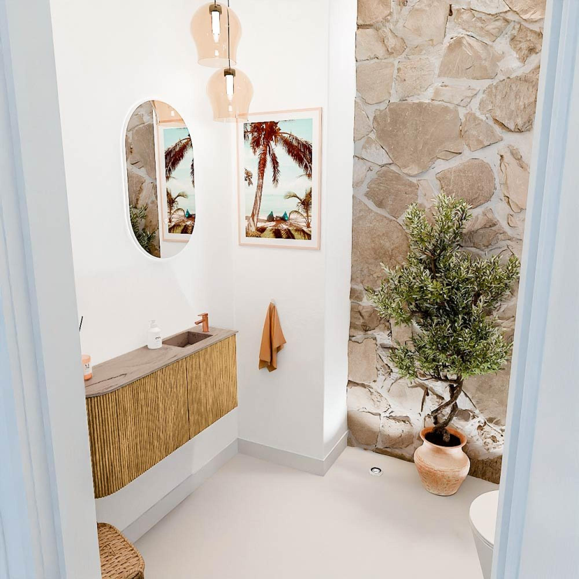 Ce meuble se distingue immédiatement par son design raffiné avec un arrondi doux sur le côté gauche, lui conférant un caractère ludique et pourtant élégant. La finition en chêne chaleureux crée une ambiance naturelle et accueillante dans votre salle de bains. Grâce à la combinaison de chêne massif à l’avant et de placage chêne sur les côtés, vous bénéficiez d’un aspect authentique qui dure des années. Le meuble s’intègre facilement dans des salles de bains modernes comme classiques, faisant de votre salle de bains un véritable point focal.