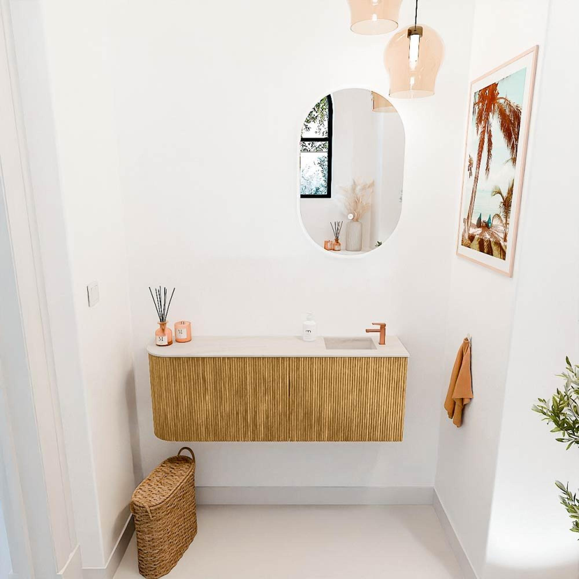 La combinaison de chêne massif avec une couleur Chêne chaude offre un look intemporel et naturel qui donne immédiatement à votre salle de bains une allure luxueuse. La structure verticale rainurée sur les portes du meuble ajoute un détail subtil mais distinctif qui confère une touche exclusive au meuble. Grâce au côté gauche arrondi, le meuble paraît non seulement élégant mais aussi accueillant. Ce design stylé s'intègre facilement dans des salles de bains modernes comme classiques, vous assurant un meuble qui restera à la mode pendant de nombreuses années.