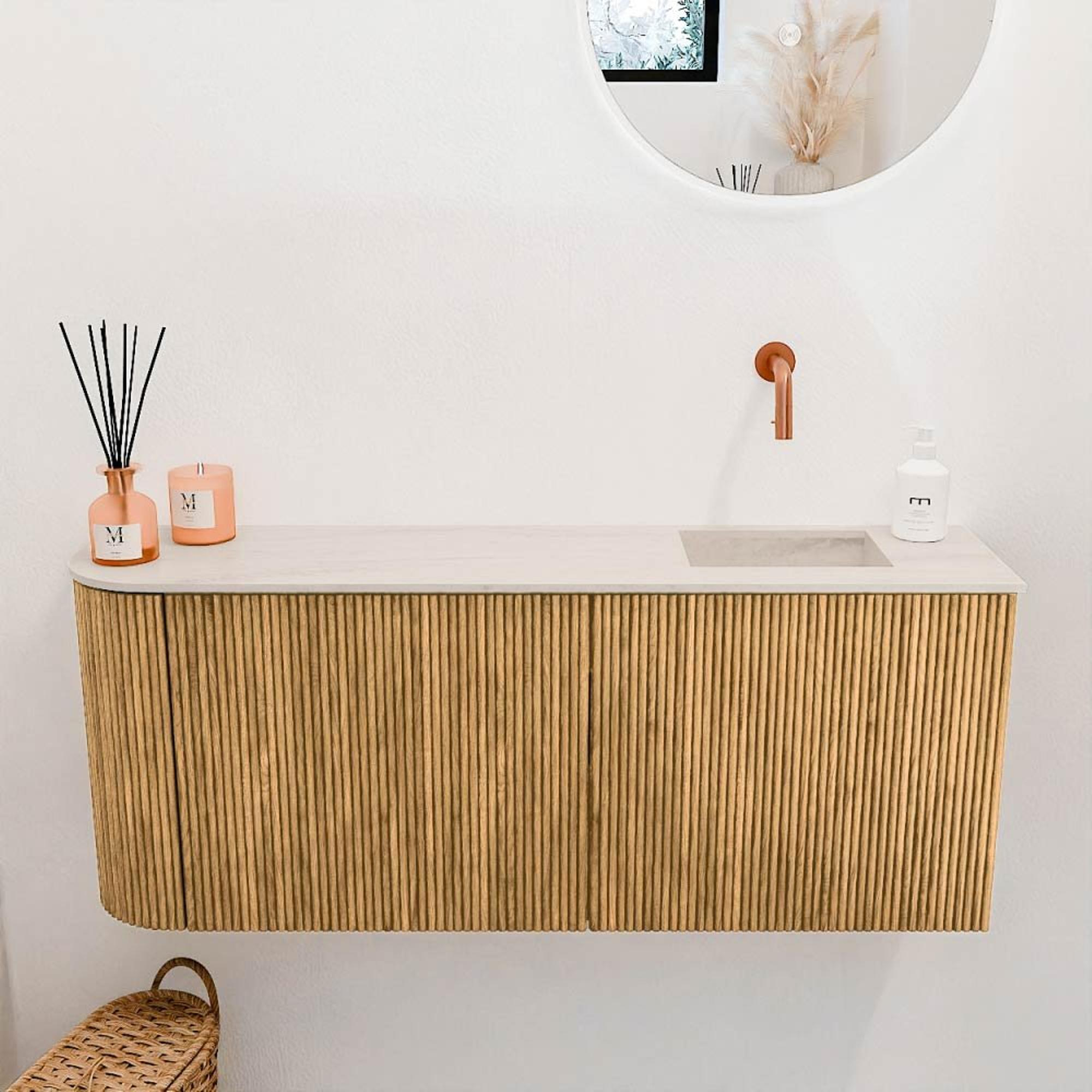 La couleur chaude du chêne et l'arrondi élégant sur le côté gauche font de ce meuble un véritable point de mire. Le design est moderne et pourtant intemporel, ce qui lui permet de s'adapter facilement à divers styles de salle de bains. Grâce aux détails subtils et à la finition de haute qualité, le meuble donne une impression de luxe sans dominer. Vous créez ainsi une atmosphère harmonieuse dans laquelle vous vous sentez immédiatement chez vous. De plus, la position droite de la vasque offre une apparence équilibrée qui apporte calme et clarté dans votre salle de bains.