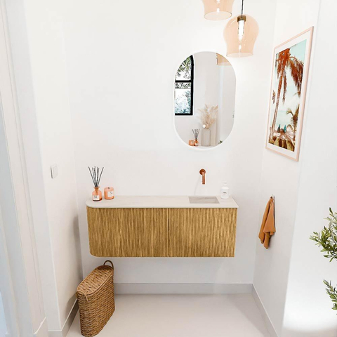 Le meuble se distingue immédiatement par les rainures verticales raffinées sur les façades, qui confèrent une apparence luxueuse et intemporelle. L'association de la couleur chaude Chêne avec l'arrondi subtil à gauche en fait un véritable point focal dans votre salle de bains. Ces détails élégants assurent que le meuble s'intègre sans effort à divers styles d'intérieur, du moderne au classique. Vous profitez ainsi d'une salle de bains non seulement fonctionnelle, mais aussi véritablement atmosphérique.