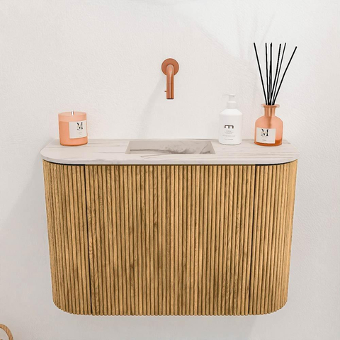 Avec ce magnifique meuble, vous donnez immédiatement à votre salle de bains un aspect frais et moderne. Le format compact de 63,2 cm de large le rend idéal pour les petits espaces, sans compromettre le style ou la fonctionnalité. La couleur chaude Oak combinée aux douces courbes des deux côtés crée une ambiance naturelle et accueillante. La vasque de couleur Nata avec une finition subtile s'accorde parfaitement avec le meuble et offre un look épuré et intemporel. Grâce à la conception réfléchie avec une porte qui ferme doucement et s'ouvre facilement, vous profitez d'une utilisation optimale. Ce meuble transforme votre salle de bains en un lieu où vous commencez et terminez chaque jour avec plaisir.