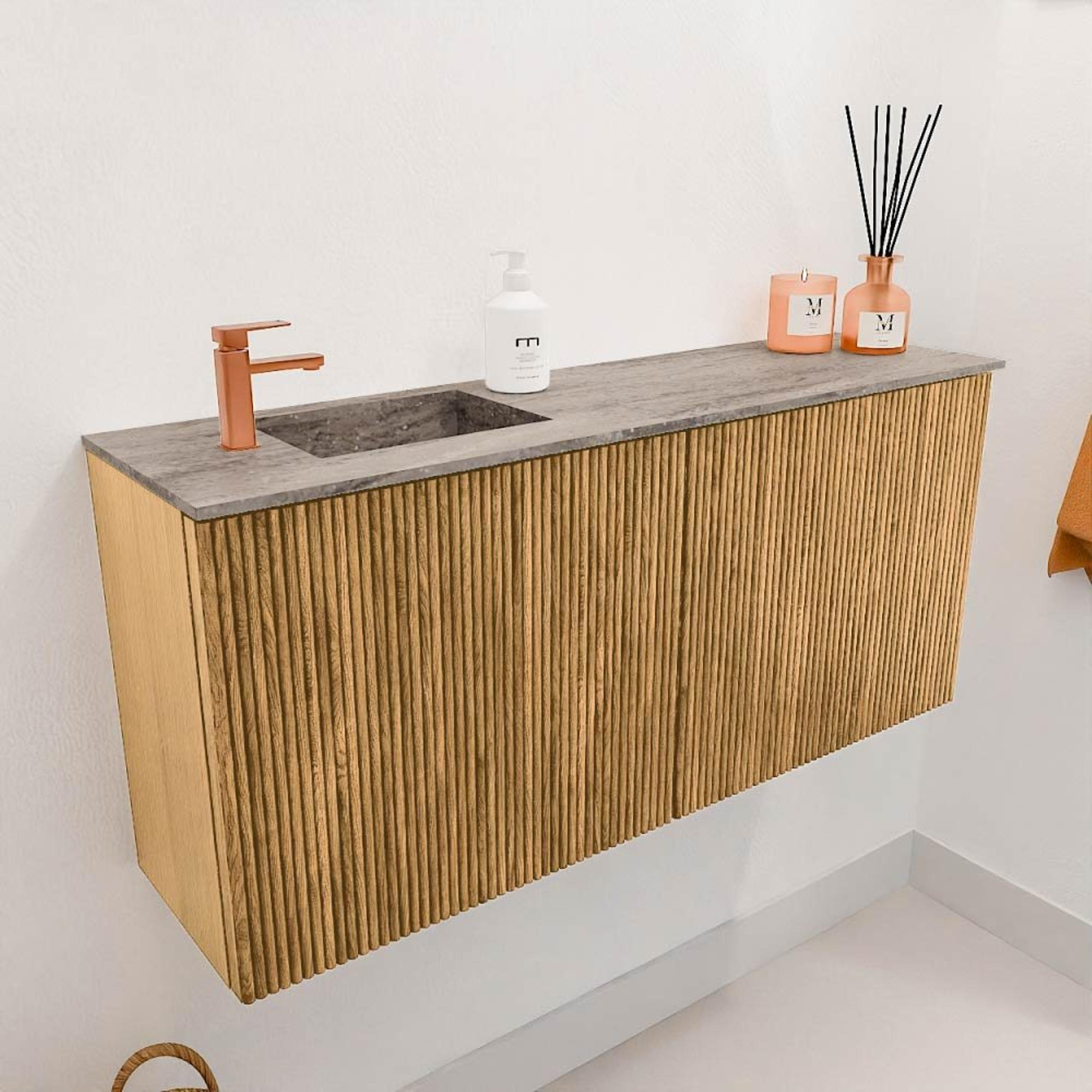 Le design de ce meuble se distingue immédiatement par la structure nervurée verticale dans le bois de chêne, qui ajoute une texture subtile mais distinctive. Ces détails élégants font de ce meuble un véritable point focal dans votre salle de bains ou toilettes. Les tons chauds du bois créent une atmosphère naturelle invitant à la détente. Grâce à son design intemporel, il s'harmonise facilement avec différents styles d'intérieur, du moderne au classique. Vous créez ainsi un espace harmonieux dont vous pouvez être fier.