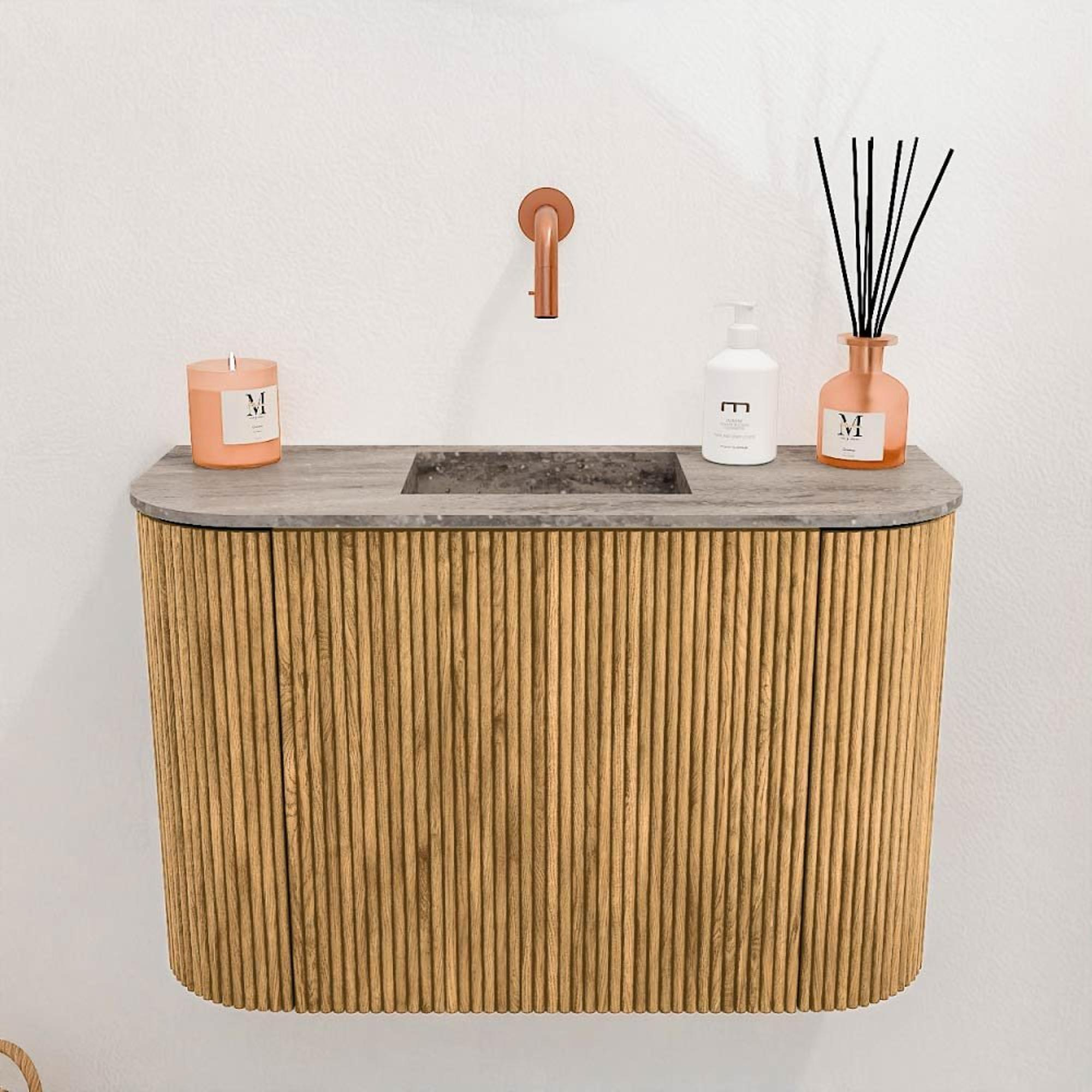 Ce meuble se distingue immédiatement par sa finition en chêne naturel avec des rainures verticales qui dégagent une élégance intemporelle. La couleur chaude Oak apporte un sentiment de calme et de confort dans votre salle de bains, tandis que les coins arrondis confèrent une apparence douce et accueillante. La vasque couleur Oza s'harmonise parfaitement avec le meuble et présente une forme moderne et minimaliste sans trou de robinet, vous laissant la liberté de choisir le robinet qui vous convient. Ainsi, vous ajoutez une touche personnelle à votre salle de bains. Grâce à son design réfléchi, ce meuble est un véritable point fort qui donne immédiatement un coup de neuf à votre espace toilettes.