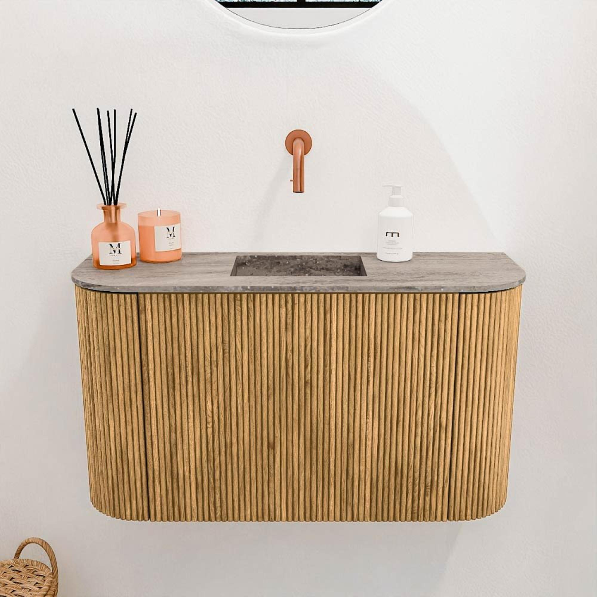 Mondiaz JOYA-DLUX 73.2cm meuble de toilettes - arrondi à gauche et à droite couleur Chêne - Lavabo FAYE position Milieu Sans trou de robinet couleur Oza.