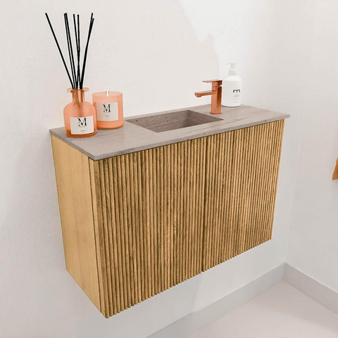 Le meuble attire immédiatement l'attention grâce à l'utilisation de chêne massif combiné avec du placage chêne, ce qui crée une apparence naturelle et chaleureuse. Les rainures verticales sur la façade donnent une touche contemporaine, permettant au meuble de s'intégrer aisément dans des salles de bains modernes comme classiques. La couleur subtile en oak ajoute une touche de calme et d'élégance à votre intérieur. Ainsi, vous créez une salle de bains qui est non seulement fonctionnelle, mais aussi visuellement attrayante et accueillante.