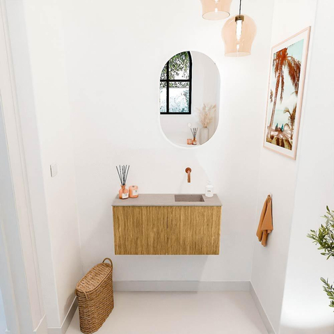 Avec une largeur de 80 cm et une profondeur de seulement 24,5 cm, ce meuble est idéal pour les petites salles de bains ou toilettes où l'espace est limité. La fixation murale crée un effet flottant, laissant le sol libre et donnant une impression d'espace plus grand. La vasque est positionnée à droite et sans trou de robinet, vous permettant de choisir vous-même le robinet qui correspond parfaitement à vos besoins. Cela rend le meuble flexible et adaptable à votre style personnel et à votre confort d'utilisation.