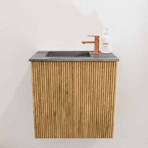 La finition naturelle en chêne donne au meuble une apparence chaleureuse et accueillante, intemporelle. La structure à rainures verticales sur les façades apporte un détail subtil mais remarquable qui confère un aspect luxueux à l'ensemble. Ce meuble s'intègre sans effort dans des intérieurs modernes comme classiques, faisant de votre salle de bains un véritable point focal. Grâce à la combinaison de chêne massif et de placage chêne, vous profitez d'un aspect bois authentique qui est non seulement beau, mais apporte aussi un sentiment de calme et de nature dans votre espace.