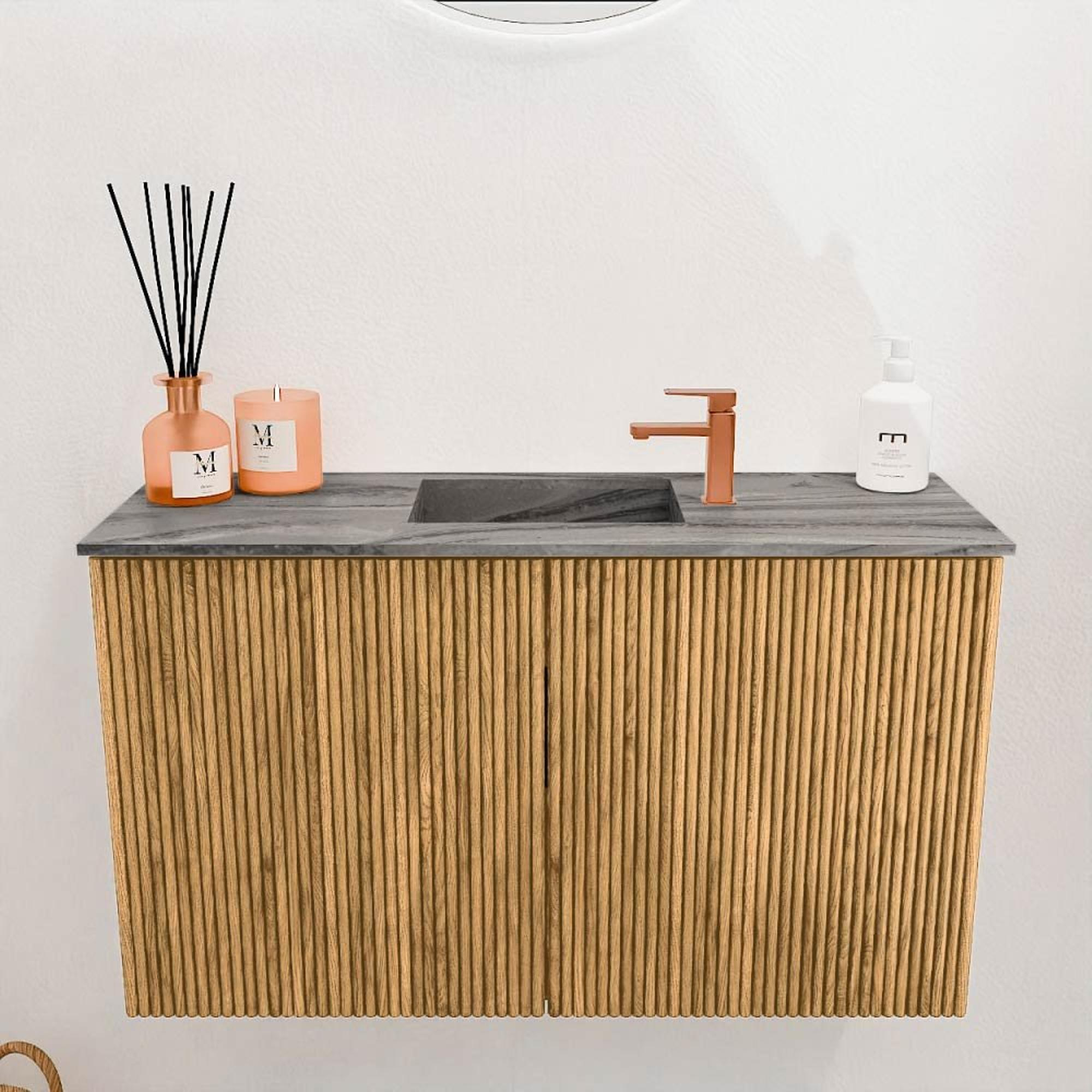 Ce meuble se distingue immédiatement par son design élégant. La couleur chêne chaude avec des rainures verticales subtiles donne un aspect naturel et luxueux qui améliore instantanément votre salle de bains. L'association avec la vasque Sombra crée un beau contraste à la fois moderne et intemporel. Grâce à son format compact, le meuble s'adapte parfaitement aux petites salles de bains ou toilettes, sans paraître encombré ou chargé. Vous profitez ainsi d'un aménagement élégant qui dégage calme et élégance, exactement ce que vous recherchez pour une expérience agréable dans votre salle de bains.