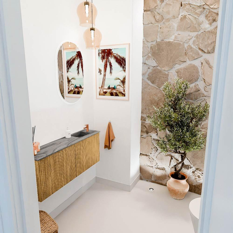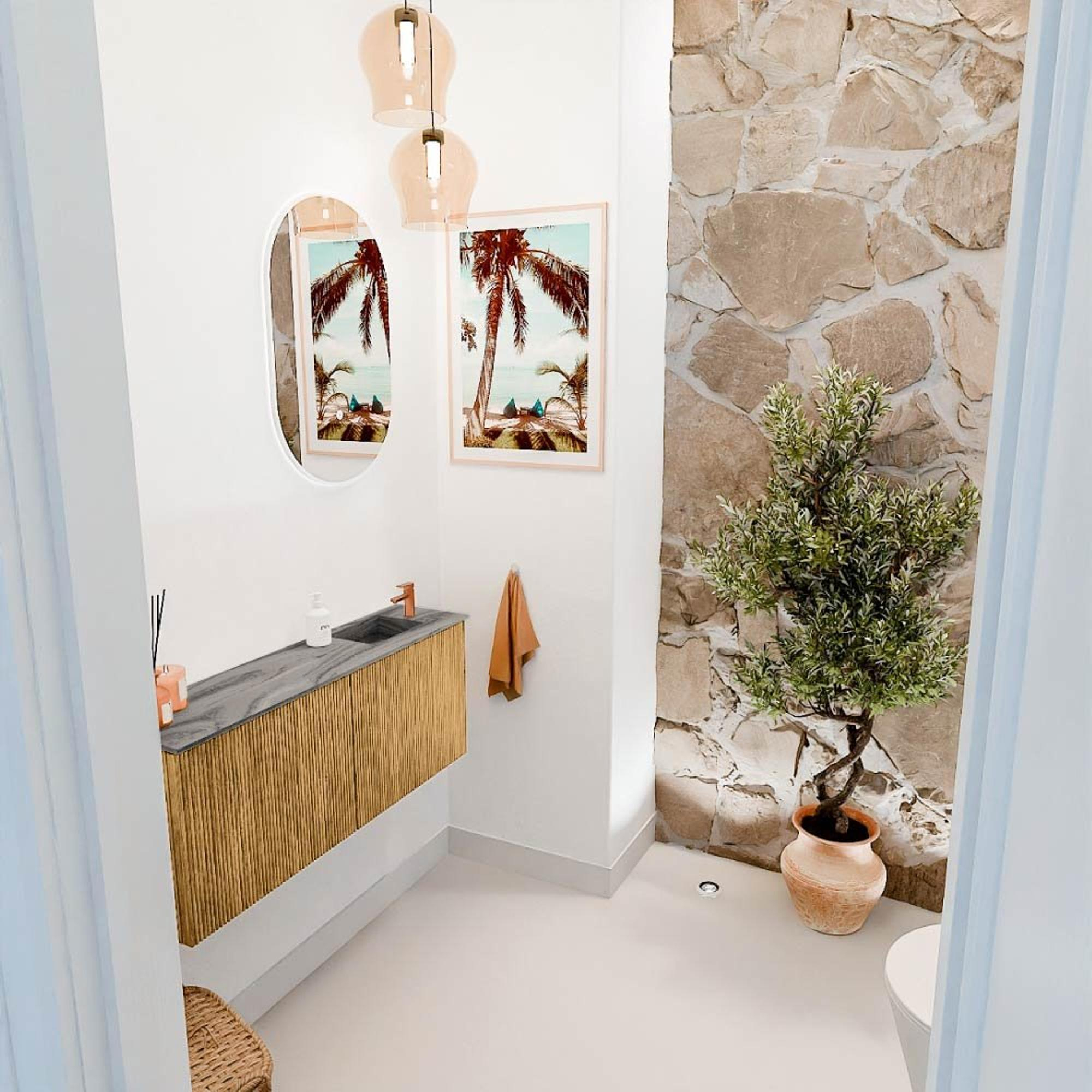 La couleur chaude chêne et les rainures verticales donnent au meuble un aspect naturel et élégant. Cela fait du meuble un véritable point focal dans votre espace toilette. Le design est intemporel et s'adapte donc à divers styles d'intérieur, du moderne au classique. Grâce à la vasque subtile Sombra avec trou de robinet à droite, une combinaison harmonieuse se crée qui dégage calme et équilibre. Vous créez ainsi une salle de bains non seulement fonctionnelle, mais aussi invitante pour se détendre et profiter.