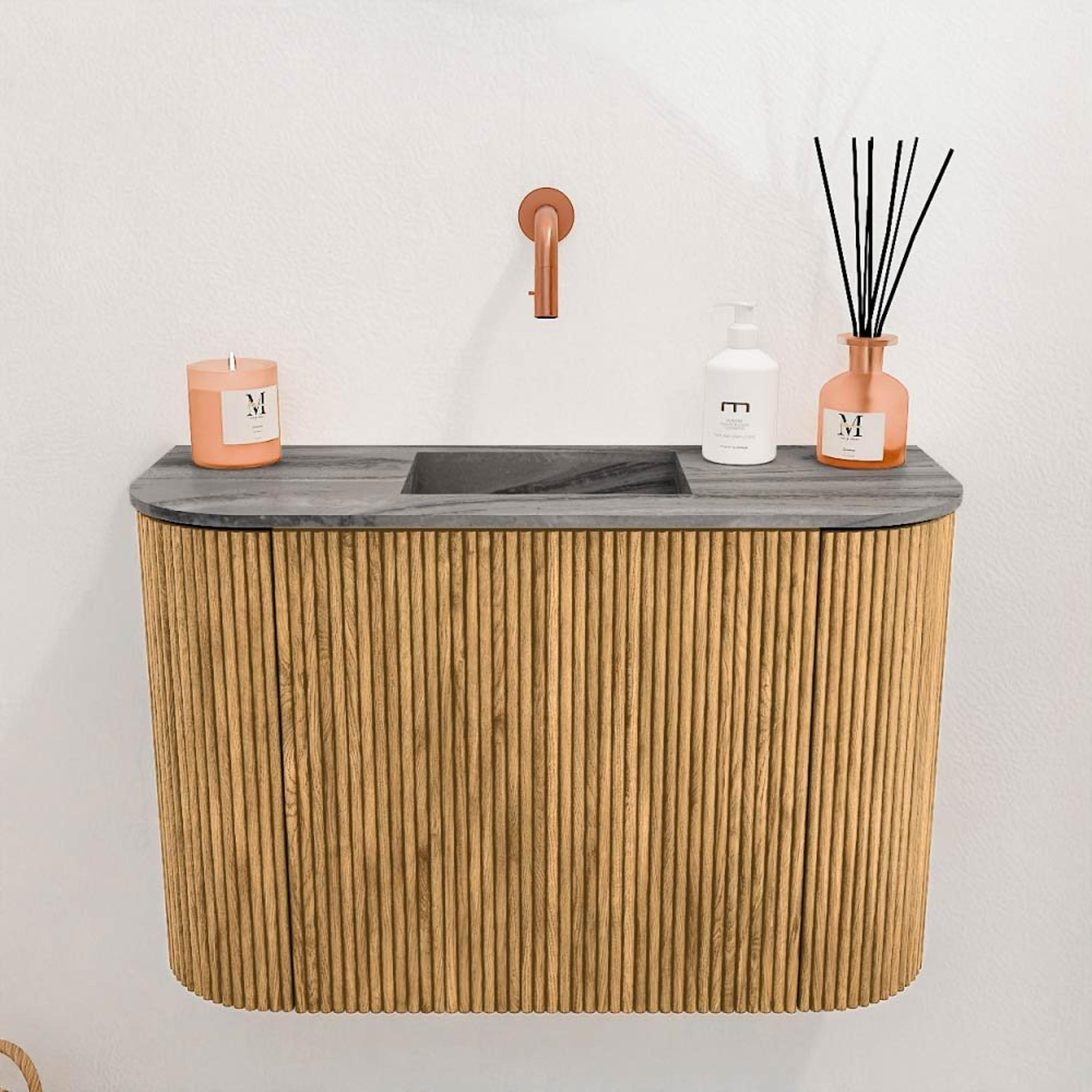 Avec ce magnifique meuble, vous donnez immédiatement à votre salle de bains ou toilettes une ambiance chaleureuse et naturelle. La combinaison de chêne massif à l'avant et de placage chêne sur les côtés assure un caractère intemporel et durable qui dure des années. Grâce à l'arrondi subtil à la fois sur le côté gauche et droit, le meuble adopte une forme douce et accueillante qui s'intègre parfaitement dans les intérieurs modernes et classiques. La vasque, placée au centre et réalisée sans trou de robinet, vous offre toute la liberté de choisir le robinet qui correspond le mieux à votre style et à vos souhaits. Ce meuble n'est pas seulement un plaisir pour les yeux, mais aussi particulièrement pratique grâce à ses dimensions intelligentes qui le rendent adapté aux petits espaces sans compromettre le rangement ou le confort. Ainsi, vous transformez facilement votre salle de bains en un lieu où vous commencez et terminez chaque jour avec plaisir.