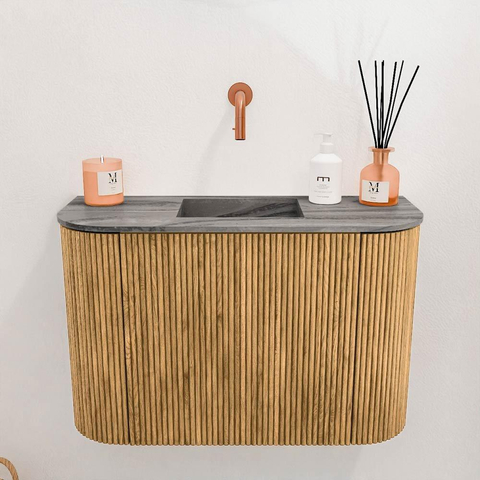 La couleur chaude du chêne et les élégants arrondis font de ce meuble un véritable point de mire. Le bois naturel crée une ambiance chaleureuse et apaisante, tandis que la finition soignée donne une touche moderne à l'ensemble. La combinaison de différentes textures de bois crée un ensemble ludique mais harmonieux qui s'adapte sans effort à divers styles de salle de bains. Ainsi, vous profitez d'un meuble qui n'est pas seulement fonctionnel, mais reflète aussi parfaitement votre goût personnel.