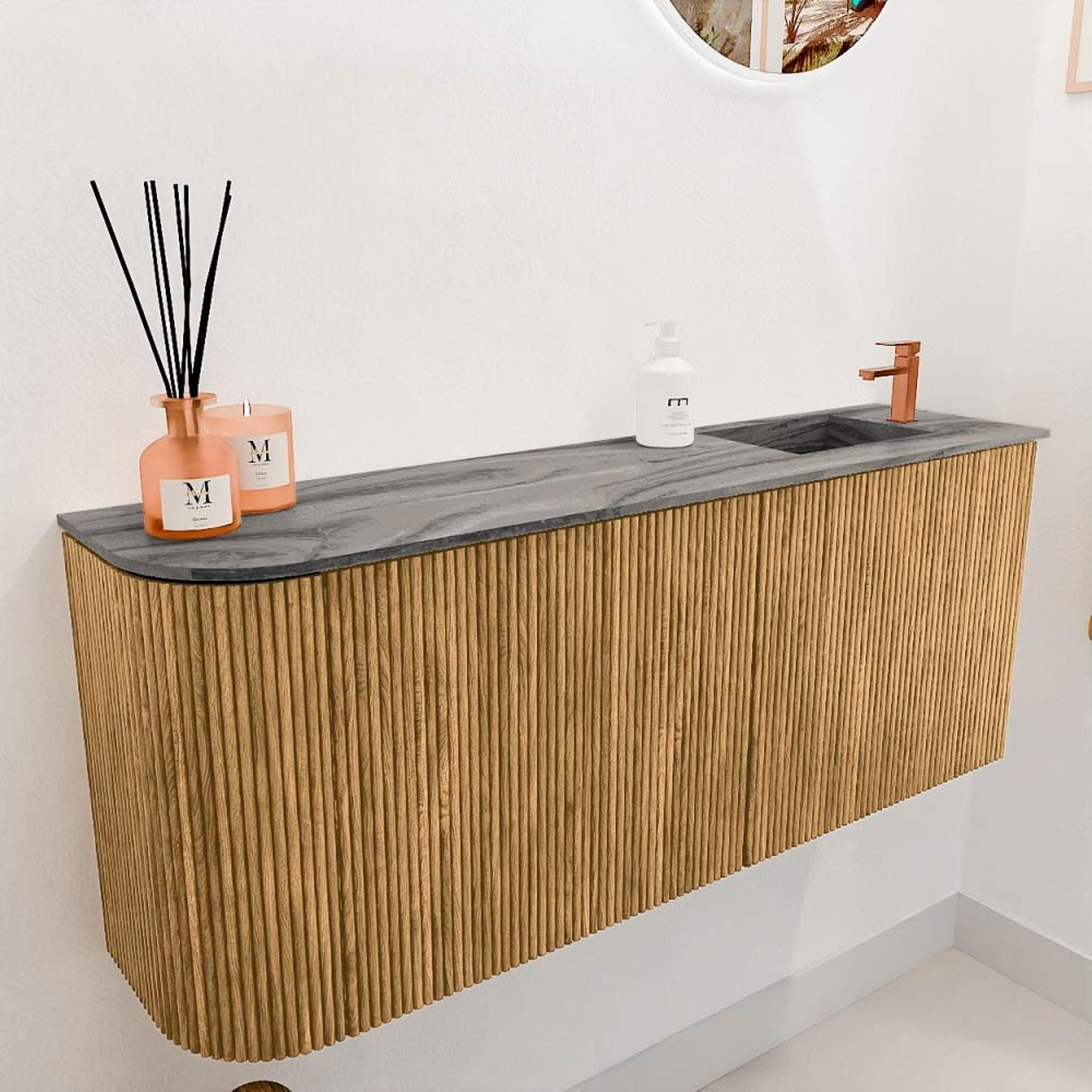 Avec ce magnifique meuble, vous donnez immédiatement à votre salle de bains une ambiance chaleureuse et naturelle. La combinaison du chêne massif à l'avant et des côtés en placage chêne subtil crée un ensemble intemporel et élégant. Grâce à la conception intelligente avec un côté gauche arrondi et une vasque positionnée à droite, vous optimisez l'espace sans sacrifier le confort. La vasque grise couleur Sombra ajoute une touche moderne et rend le meuble particulièrement polyvalent dans différents styles de salle de bains. Ce meuble n'est pas seulement un plaisir pour les yeux, mais aussi extrêmement pratique grâce au grand espace de rangement derrière les deux portes. Ainsi, vous gardez votre salle de bains propre et organisée tout en profitant d'un environnement apaisant et élégant.
