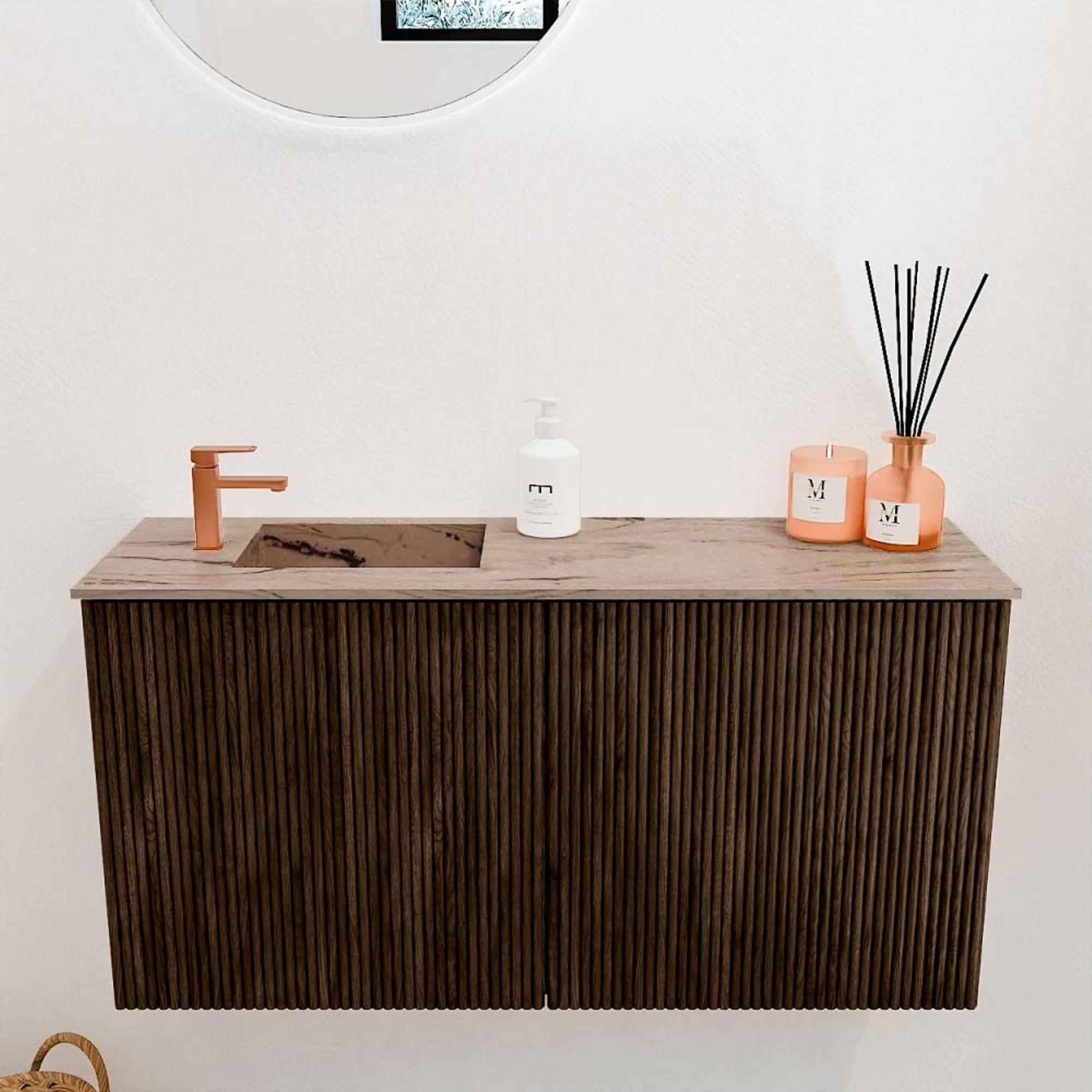 La chaude couleur noyer et les façades en chêne massif donnent au meuble une apparence naturelle et luxueuse. Les rainures verticales apportent un détail subtil mais distinctif qui donne une touche moderne à l’ensemble. Ce meuble est conçu pour être un véritable point focal dans votre salle de bains, sans être envahissant. Grâce à son design intemporel, il s’adapte aisément aux salles de bains classiques comme modernes. Ainsi, vous profiterez pendant des années d’un meuble stylé qui reflète parfaitement votre goût personnel.