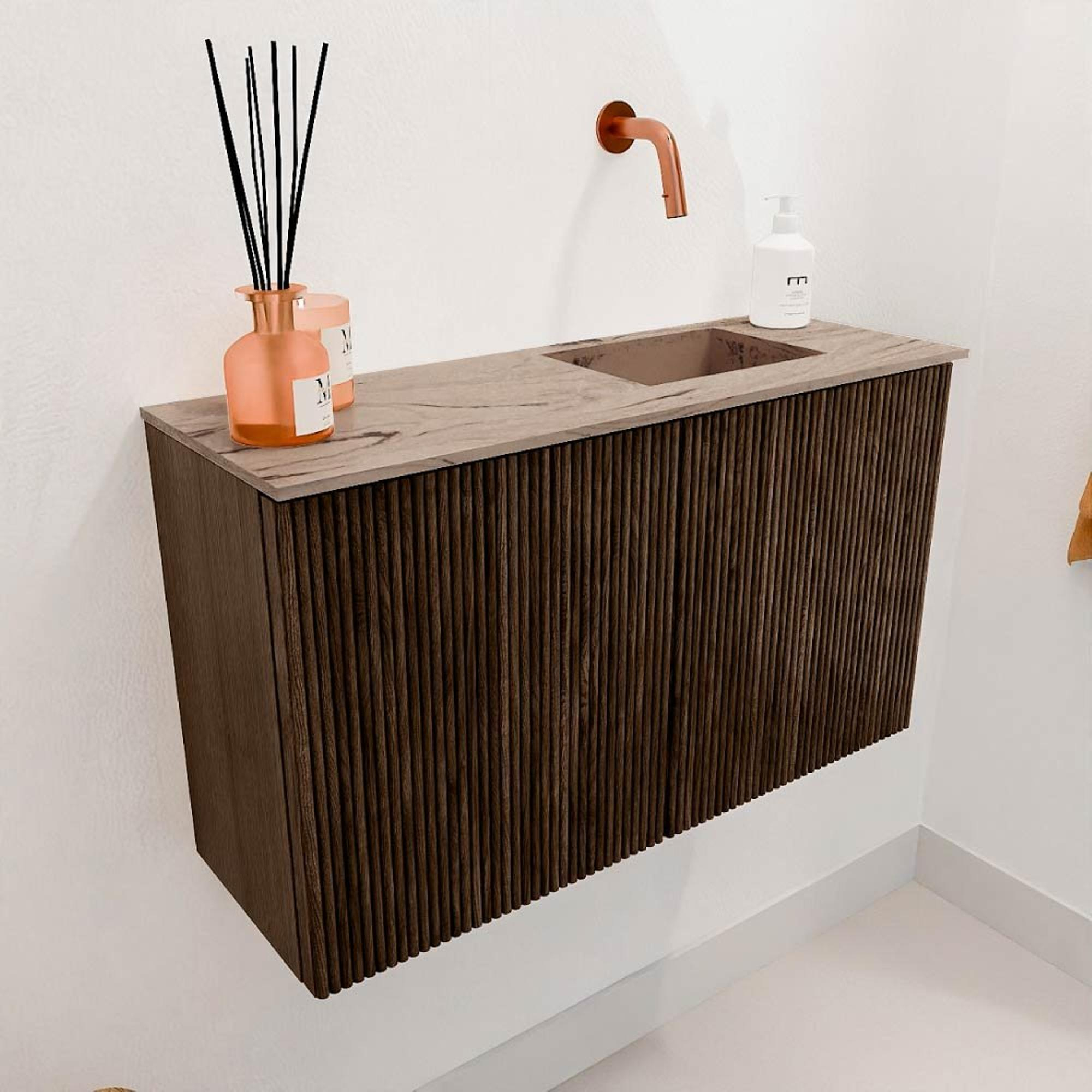 La chaude couleur noyer et le motif strié vertical sur les façades confèrent au meuble une allure luxueuse qui attire immédiatement l’attention. Ce design a été soigneusement choisi pour apporter une sensation de calme et d’élégance dans votre salle de bains. Le meuble est un véritable point focal, sans être envahissant, et s’intègre parfaitement dans des salles de bains modernes comme classiques. Grâce aux tons naturels du bois, vous ajoutez une touche de nature qui crée une atmosphère agréable où vous pouvez vous détendre chaque jour.