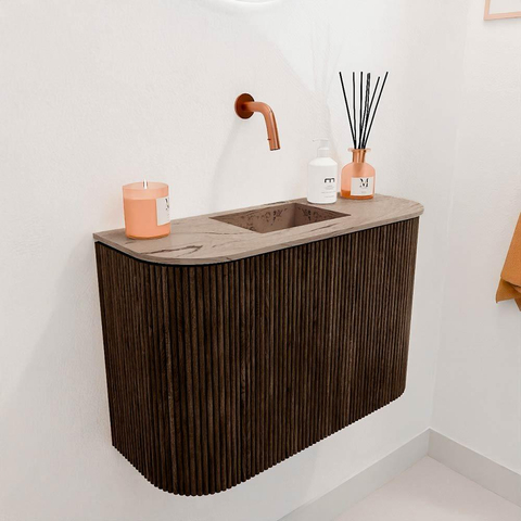 Avec sa couleur chaude noyer et les rainures verticales raffinées sur la porte, ce meuble est un véritable point focal. Les côtés arrondis lui donnent une apparence douce et accueillante qui confère immédiatement à votre salle de bains une atmosphère luxueuse et personnelle. Grâce à l'utilisation de matériaux de haute qualité et à un design réfléchi, le meuble dégage une classe sans être envahissant. Vous ajoutez ainsi un accent élégant qui convainc tant par sa fonctionnalité que par son esthétique.