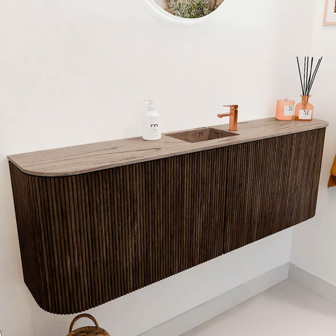 Le meuble est fini avec des façades en chêne massif et des panneaux latéraux en placage de chêne, ce qui assure une apparence naturelle et luxueuse. La chaude couleur noyer s’intègre parfaitement dans divers styles d’intérieur, du moderne au classique. Les arrondis subtils sur les côtés gauche et droit donnent au meuble un caractère unique et en font un véritable point focal dans votre salle de bains. Grâce à la combinaison de matériaux de haute qualité et d’un design réfléchi, vous profitez d’un meuble qui est non seulement beau, mais aussi parfaitement adapté à votre style personnel.