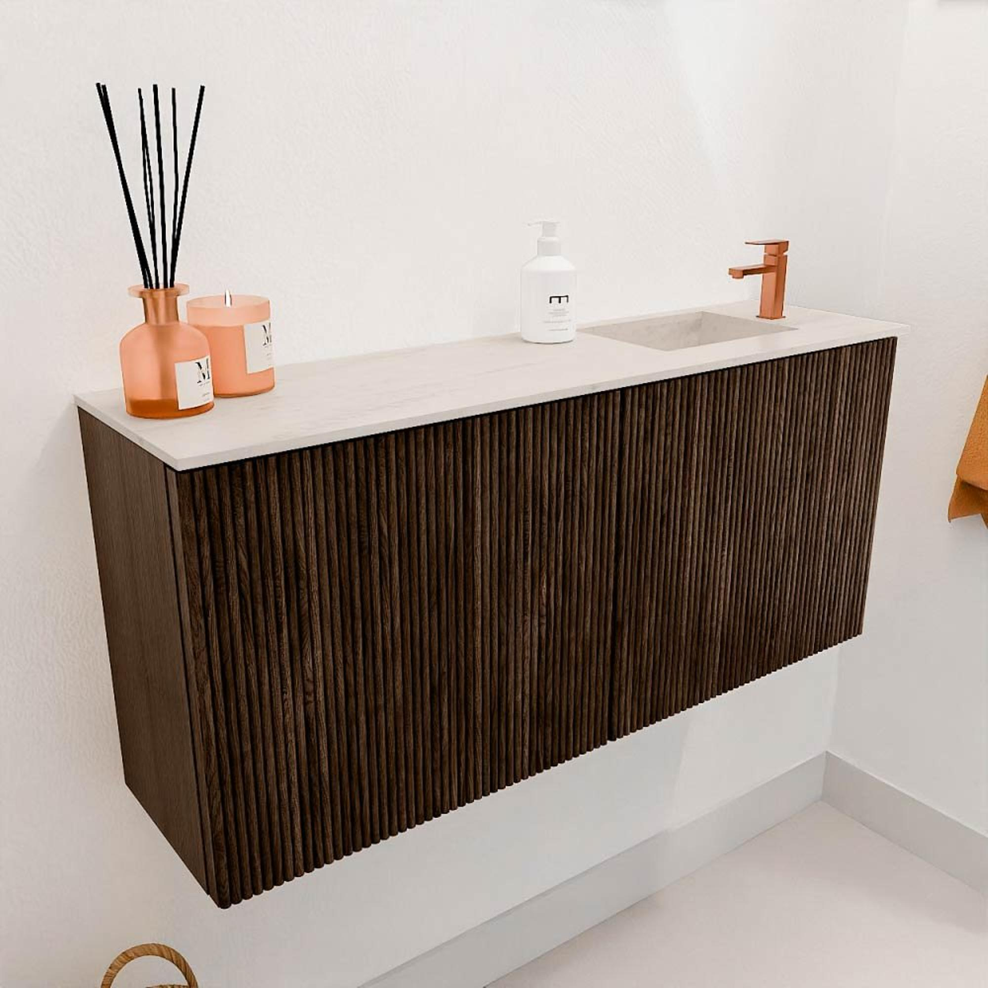 Le meuble est fabriqué en chêne massif, ce qui assure non seulement une construction robuste et durable, mais aussi une élégance intemporelle. La couleur chaude noyer et les rainures verticales donnent à l'ensemble un aspect raffiné qui s'harmonise facilement avec différents styles d'intérieur. Ainsi, vous créez une salle de bains qui est non seulement fonctionnelle, mais aussi un véritable point focal. Grâce au design avec la vasque à droite, le meuble s'adapte parfaitement à vos préférences personnelles et à l'agencement de l'espace.