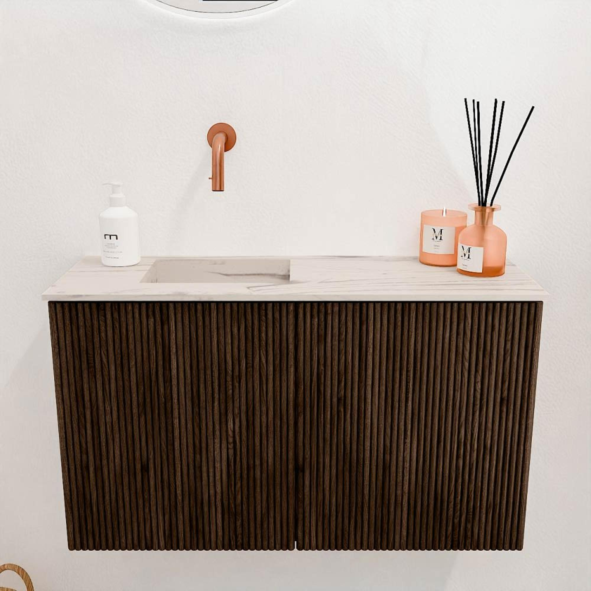 Mondiaz JOYA-DLUX 70cm meuble de salle de bains - couleur Walnut - Vasque FAYE position Gauche Sans trou de robinet couleur Nata.