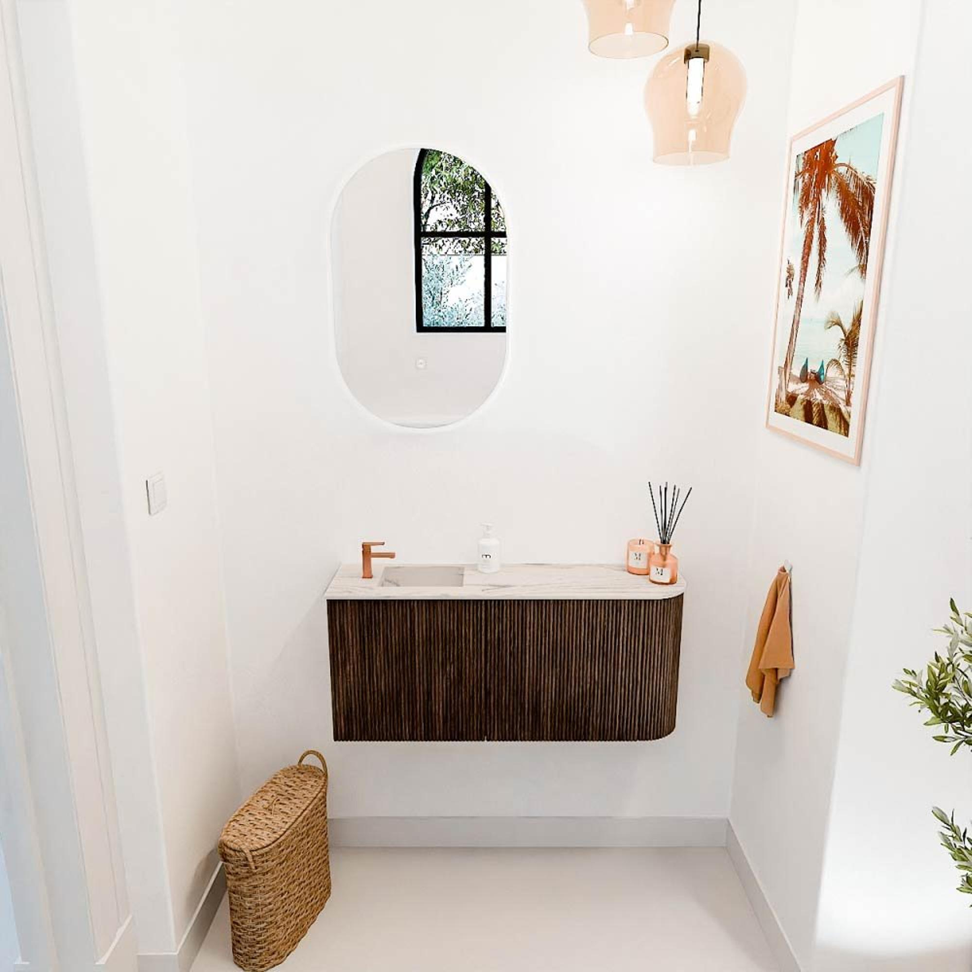 Mondiaz JOYA-DLUX Meuble de salle de bains - 91,6cm - arrondi droit couleur Noyer - Vasque FAYE position Gauche 1 trou de robinet couleur Nata
