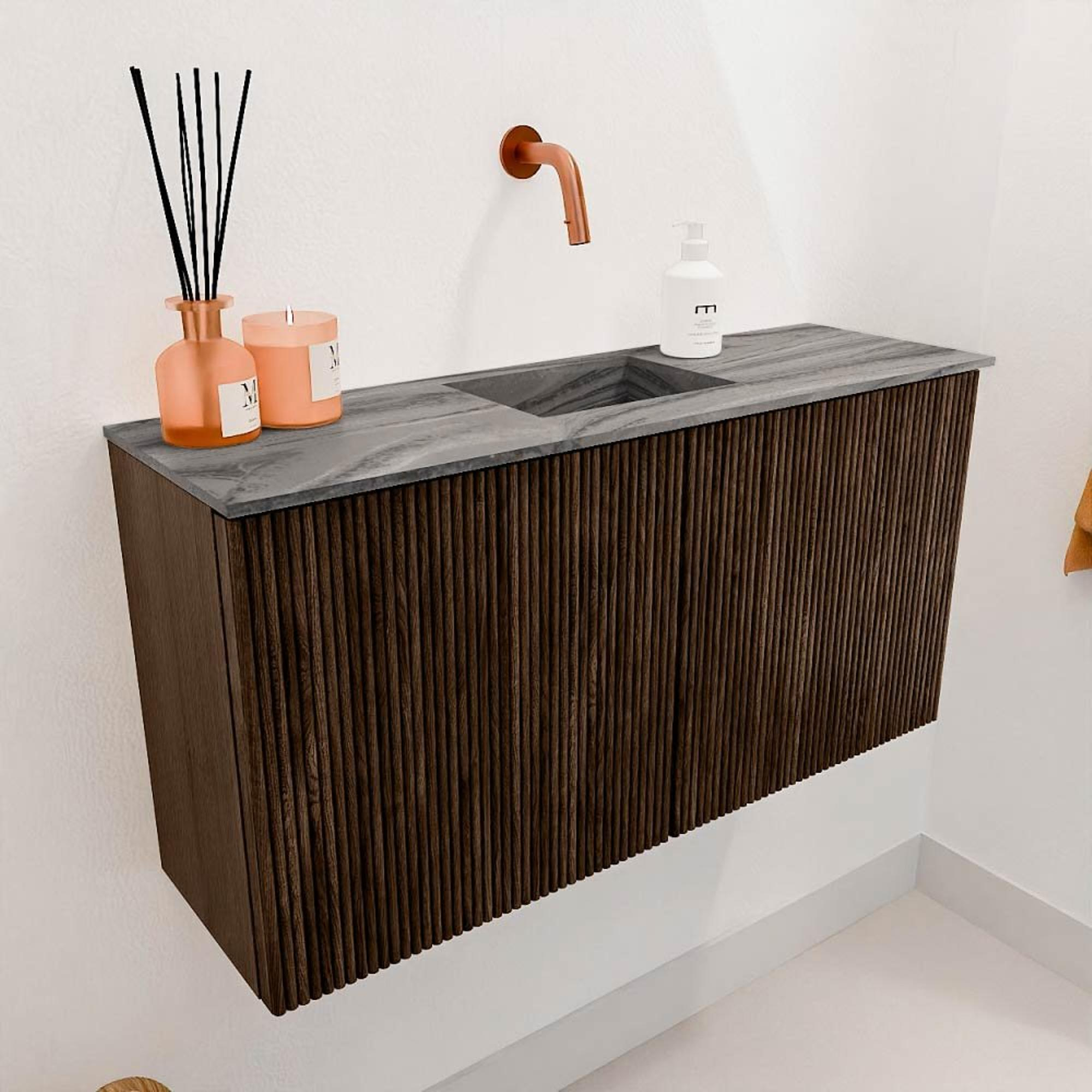 Ce meuble est un exemple d'élégance intemporelle. La couleur chaude noyer et l'utilisation de chêne massif lui confèrent une apparence naturelle et luxueuse qui s'intègre dans presque toutes les salles de bains. Les rainures verticales ajoutent un accent de design subtil, donnant au meuble une touche moderne sans dominer. Grâce au design suspendu et épuré, votre salle de bains paraît plus spacieuse et ordonnée. Ainsi, vous profitez non seulement d'un beau meuble, mais aussi d'une salle de bains qui dégage calme et style.