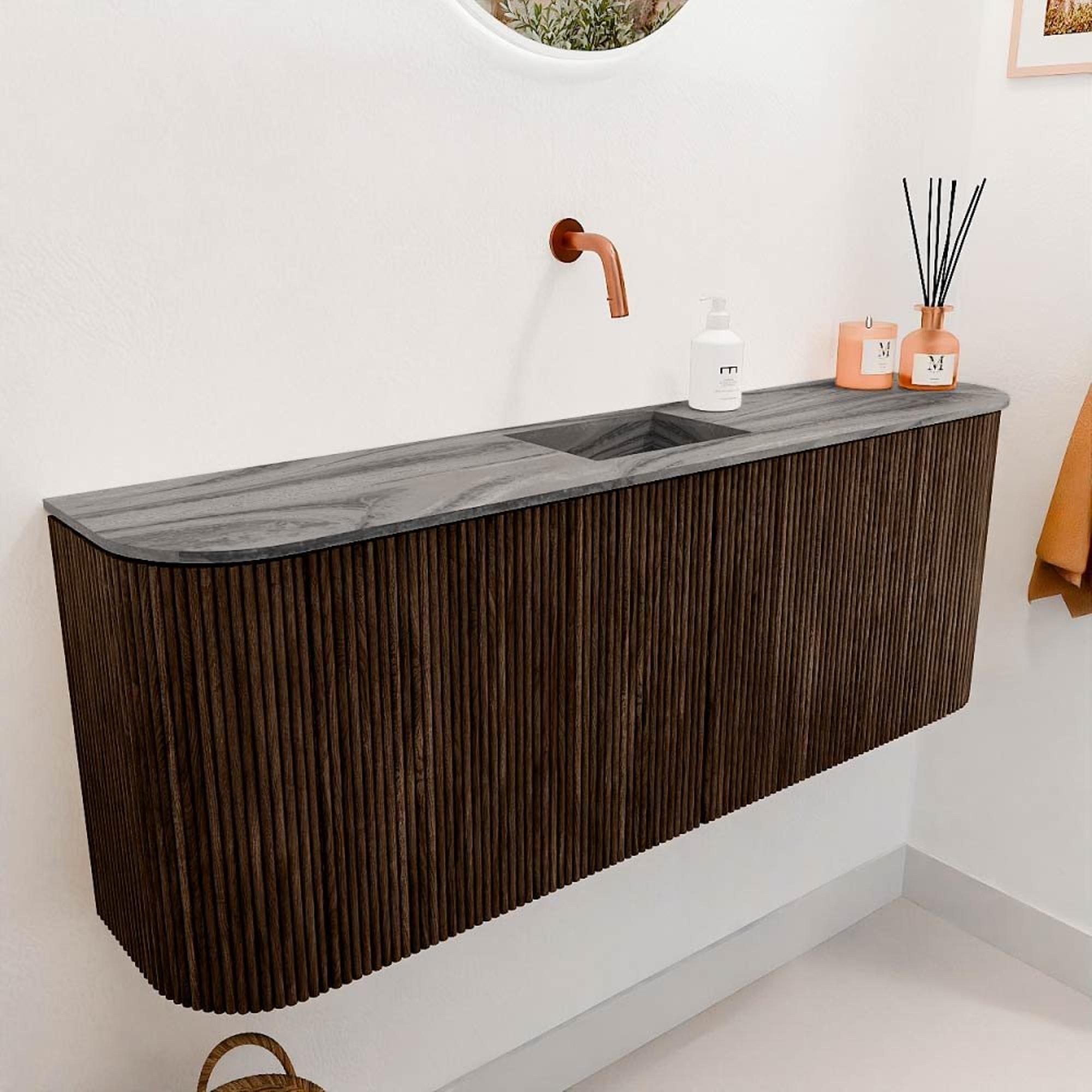 La couleur chaude noyer et le motif à rainures verticales donnent au meuble une apparence intemporelle et élégante. La double arrondie sur les côtés gauche et droit rend le design unique et crée une forme douce et organique qui s'intègre parfaitement dans les salles de bains modernes et classiques. La combinaison de chêne massif et de contreplaqué plaqué chêne dégage un savoir-faire et une qualité. Ainsi, vous ajoutez non seulement un élément fonctionnel, mais aussi un véritable point focal qui donne à votre salle de bains une apparence exclusive.