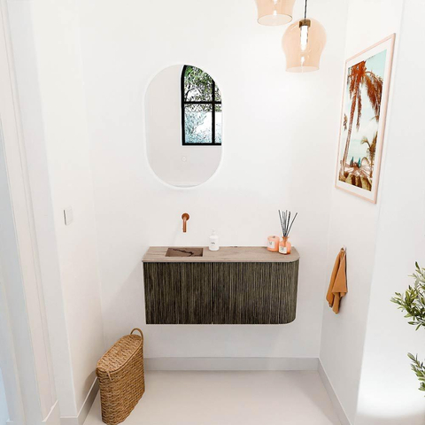 Le meuble se distingue immédiatement par son arrondi élégant sur le côté droit et la structure verticale cannelée sur les façades. La combinaison de chêne massif à l'avant avec du placage de chêne sur les côtés donne à l'ensemble un aspect naturel et luxueux. La couleur Shadow renforce cette ambiance chaleureuse et s'accorde parfaitement avec la vasque douce Arena. Cela fait du meuble un véritable point focal dans votre salle de bains, sans dominer. Vous créez ainsi un environnement élégant dans lequel vous vous sentez bien chaque jour.