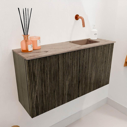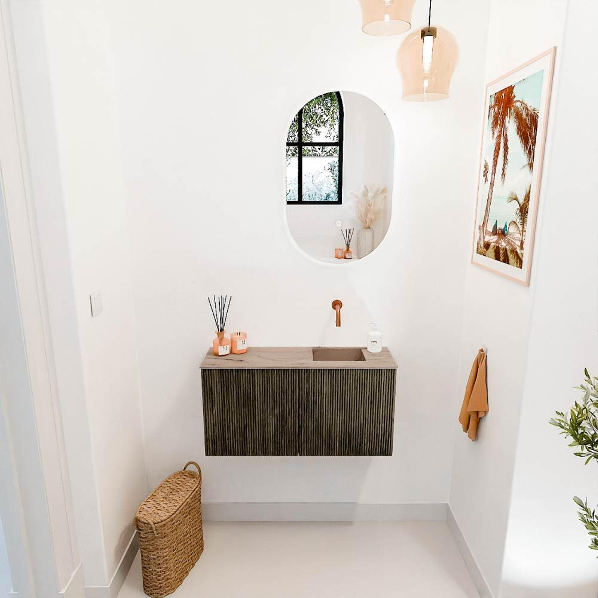 Le meuble se distingue immédiatement par son apparence moderne et raffinée. La combinaison de la couleur profonde Shadow avec la vasque douce Arena crée un ensemble harmonieux qui s'intègre facilement dans divers styles de salle de bains. Grâce au design minimaliste et aux lignes épurées, votre espace obtient une ambiance calme et luxueuse. Ce meuble est un véritable point focal qui améliore votre salle de bains sans dominer. Ainsi, vous profitez chaque jour d'un environnement élégant qui invite à la détente.