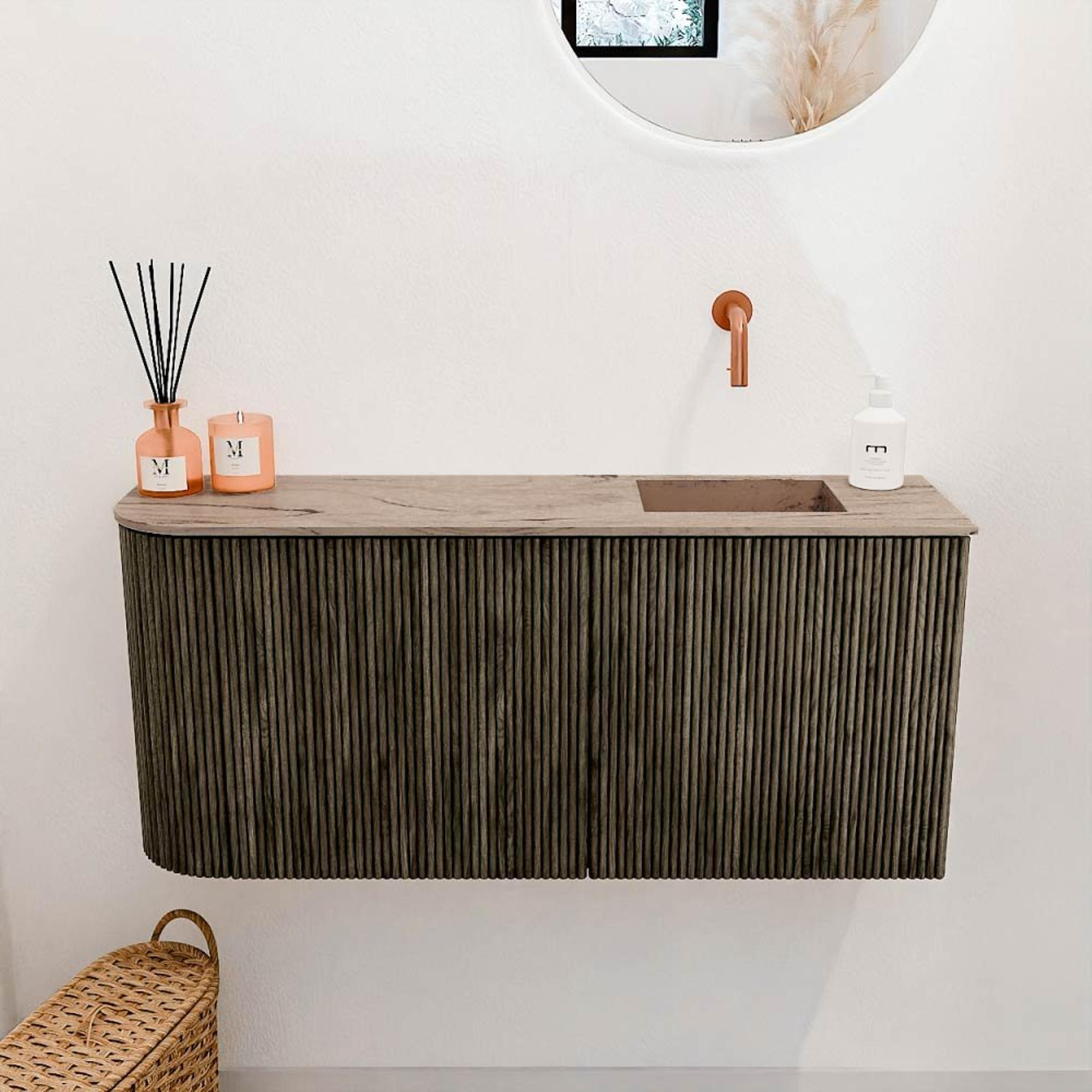 Avec son arrondi élégant à gauche et la combinaison de la couleur profonde Shadow avec la vasque claire Arena, ce meuble est un véritable point de mire. La finition bois naturel des façades en chêne massif procure une apparence chaleureuse et luxueuse qui s'adapte parfaitement à divers styles d'intérieur. Vous ajoutez ainsi facilement une atmosphère contemporaine et raffinée à votre salle de bains. Le contraste subtil des couleurs rend le meuble polyvalent et facile à assortir avec d'autres accessoires de salle de bains.
