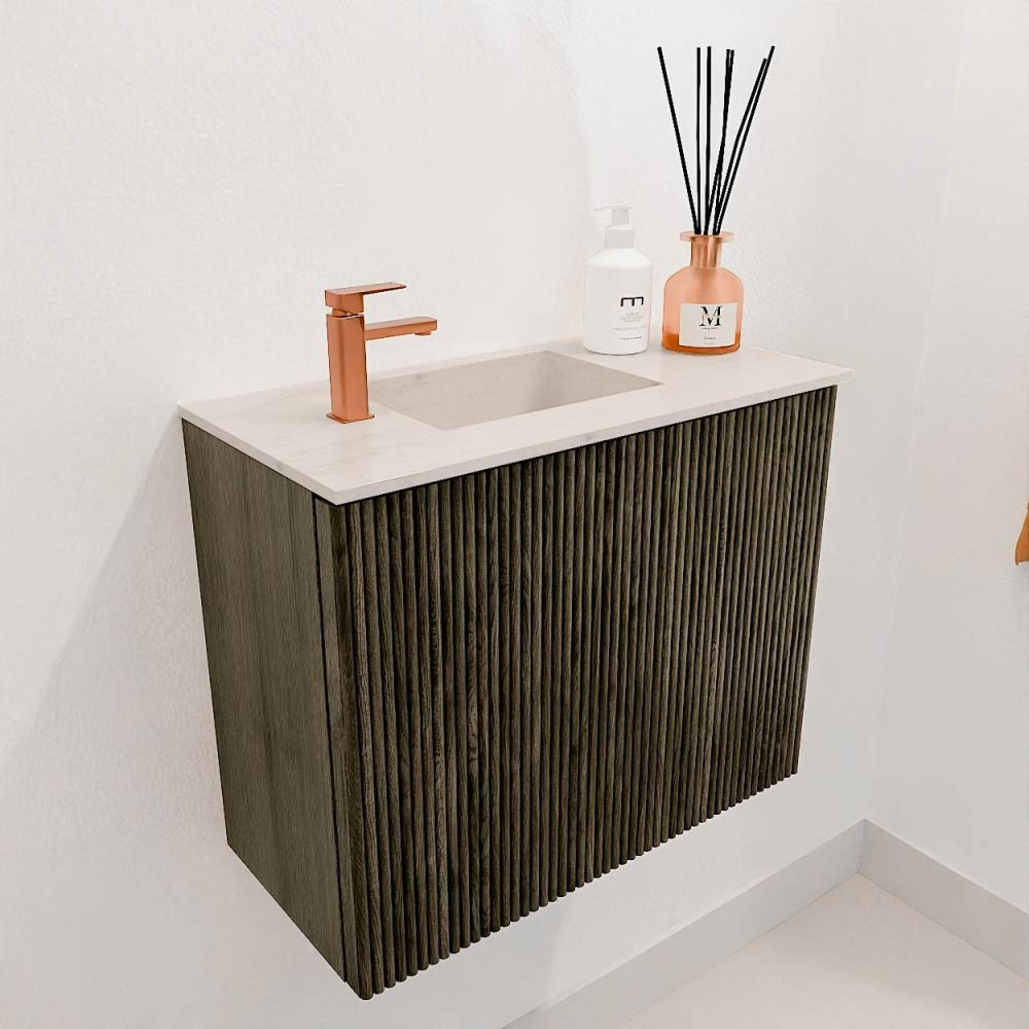 Avec une largeur de 50 cm et une profondeur de 24,5 cm, ce meuble est idéal pour les petits espaces où vous ne voulez pas renoncer au rangement. La vasque avec trou de robinet à gauche est placée de manière pratique pour optimiser l'utilisation de l'espace disponible. La porte avec rainures verticales s'ouvre en douceur et offre suffisamment d'espace pour ranger soigneusement vos articles de toilette. Grâce à la fixation murale, le sol reste libre, ce qui crée une sensation d'espace et facilite le nettoyage. Ce meuble combine design et facilité d'utilisation de manière intelligente.