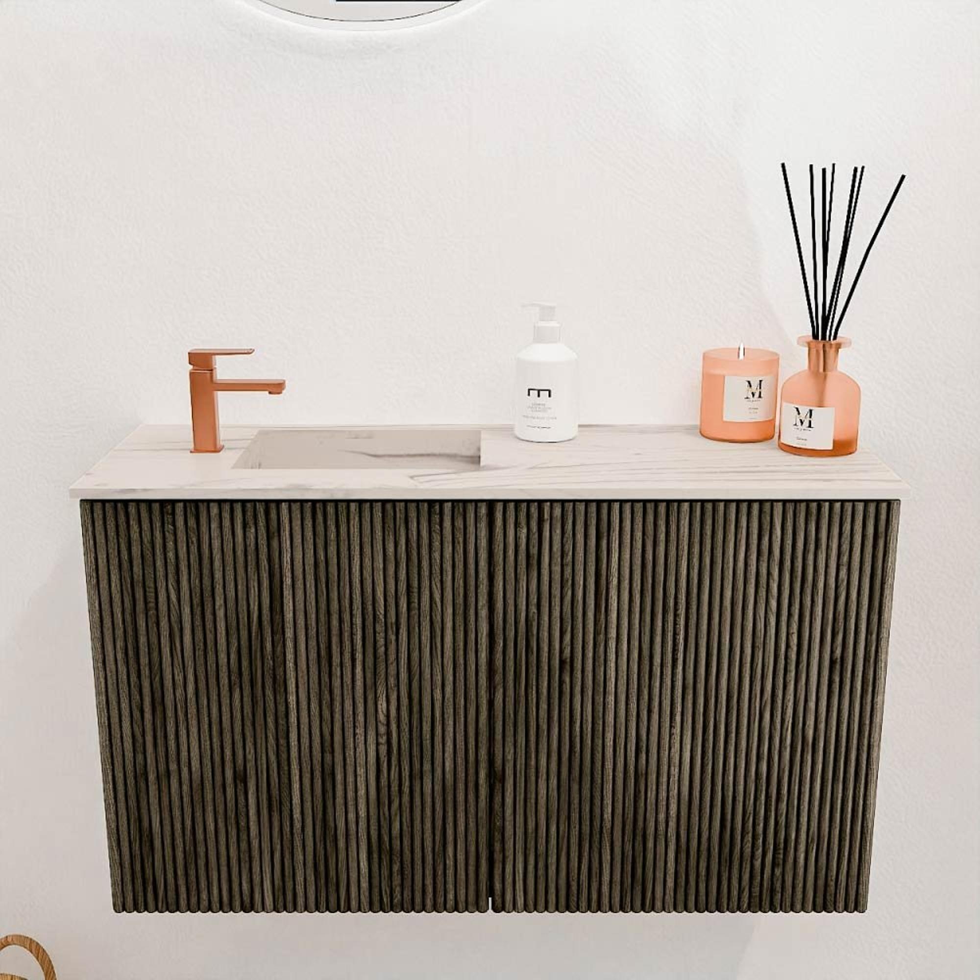 Un meuble de salle de bains qui n'est pas seulement pratique, mais qui apporte aussi une atmosphère chaleureuse et naturelle dans votre salle de bains. Ce meuble combine une apparence élégante avec une fonctionnalité intelligente, rendant votre salle de bains immédiatement plus agréable. Grâce à son format compact, il s'adapte parfaitement aux petits espaces, sans sacrifier l'espace de rangement ni le confort. La combinaison du meuble de couleur sombre Shadow avec la vasque claire et élégante de couleur Nata crée un magnifique contraste qui donne à votre salle de bains un aspect moderne et pourtant intemporel. Le meuble est conçu pour faciliter votre routine quotidienne tout en créant une ambiance apaisante dont vous profiterez chaque jour.