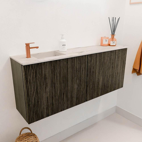Avec ce magnifique meuble, vous offrez à votre salle de bains ou toilettes d'invités une mise à niveau élégante et fonctionnelle immédiate. Le design compact de 100 cm de large s'adapte parfaitement aux petits espaces, sans compromettre l'espace de rangement ni l'esthétique. La couleur chaude et profonde Shadow combinée aux rainures verticales élégantes crée une ambiance exclusive qui donne à votre salle de bains un aspect unique. La vasque, subtilement placée à gauche, est réalisée dans la couleur douce Nata et dispose d'un trou de robinet pour votre robinet préféré. Grâce aux matériaux de haute qualité et au design réfléchi, vous profitez non seulement d'un beau meuble, mais aussi d'une utilisation pratique pendant de nombreuses années. Ce meuble facilite l'organisation de vos accessoires de salle de bains et assure un aspect ordonné et frais qui vous ravira chaque jour.