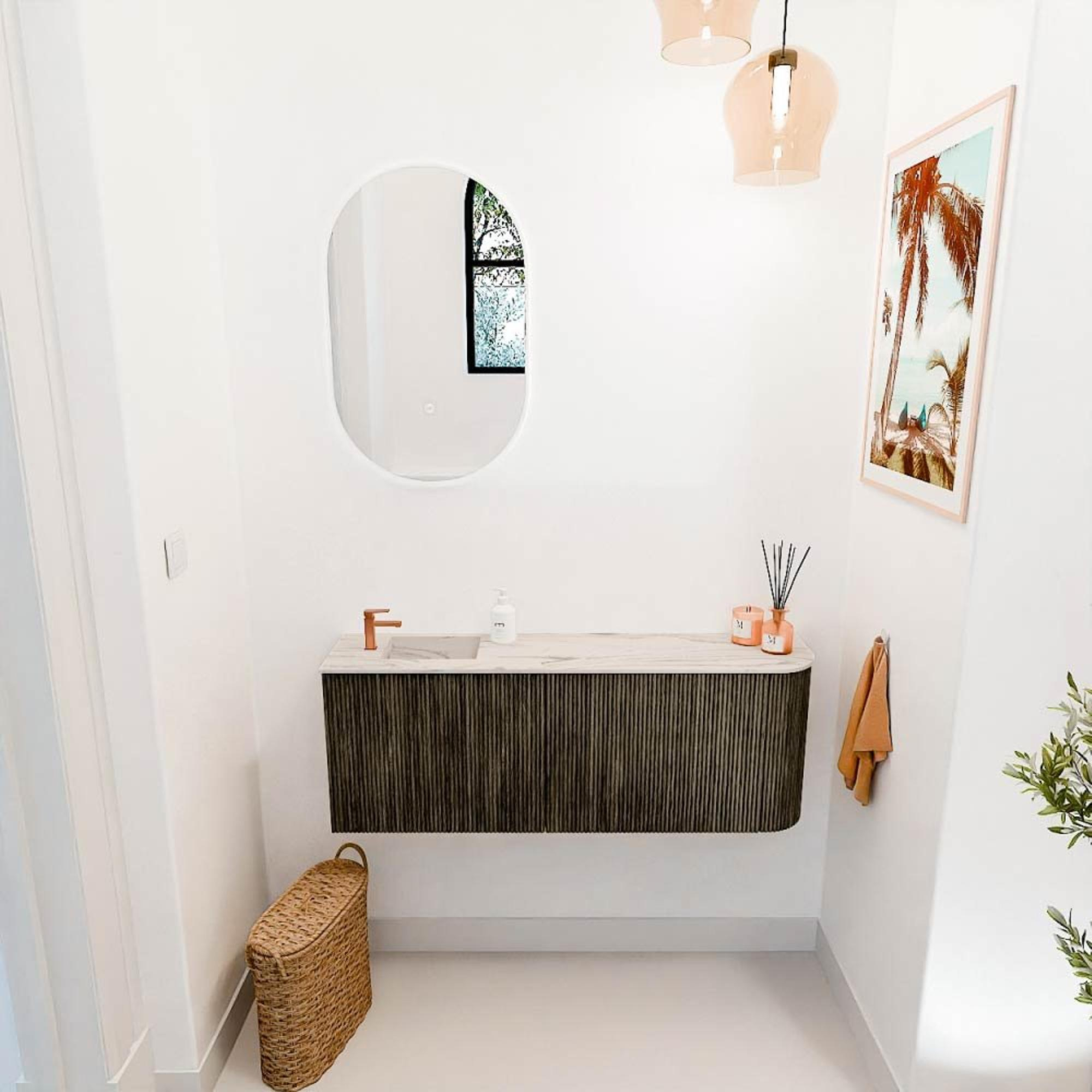 Le meuble se distingue immédiatement par son arrondi élégant sur le côté droit et les rainures verticales qui donnent une texture raffinée à la façade. La couleur Shadow offre une base sombre intemporelle qui s'harmonise facilement avec différents styles de salle de bains. Par le subtil jeu des formes et des couleurs, vous créez une atmosphère à la fois moderne et chaleureuse. Cela fait du meuble non seulement un élément fonctionnel, mais aussi une pièce maîtresse élégante dans votre salle de bains.