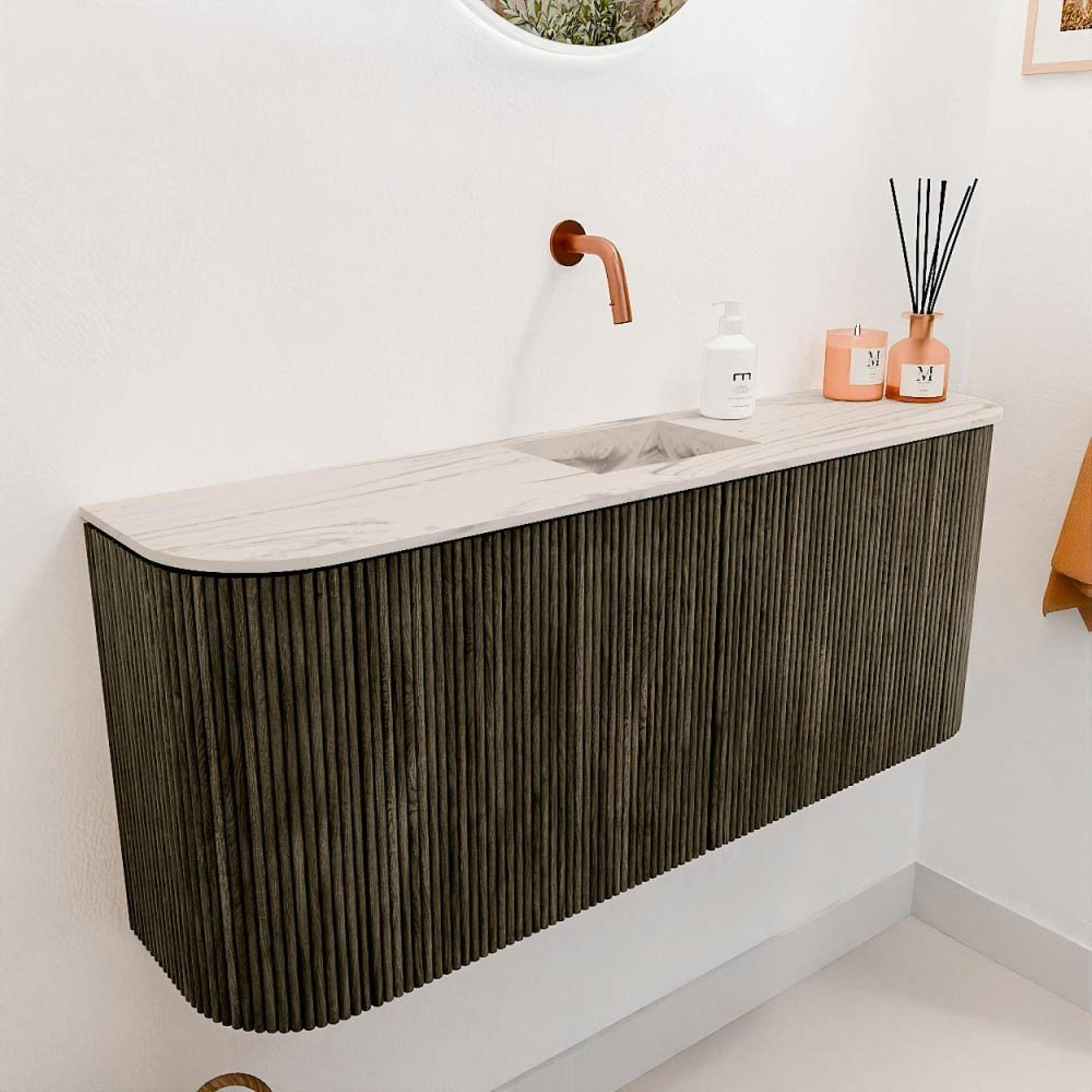 La structure verticale à nervures et les courbes subtiles font de ce meuble un véritable point de mire. La combinaison de la couleur chaude Shadow avec la vasque claire Nata crée un ensemble harmonieux qui s'intègre facilement dans différents styles de salle de bains. Que vous optiez pour un aménagement moderne, campagnard ou classique, ce meuble ajoute toujours une touche de raffinement. Le design est soigneusement travaillé, ce qui fait que le meuble est non seulement beau à voir, mais apporte aussi un sentiment de calme et d'équilibre dans votre salle de bains.