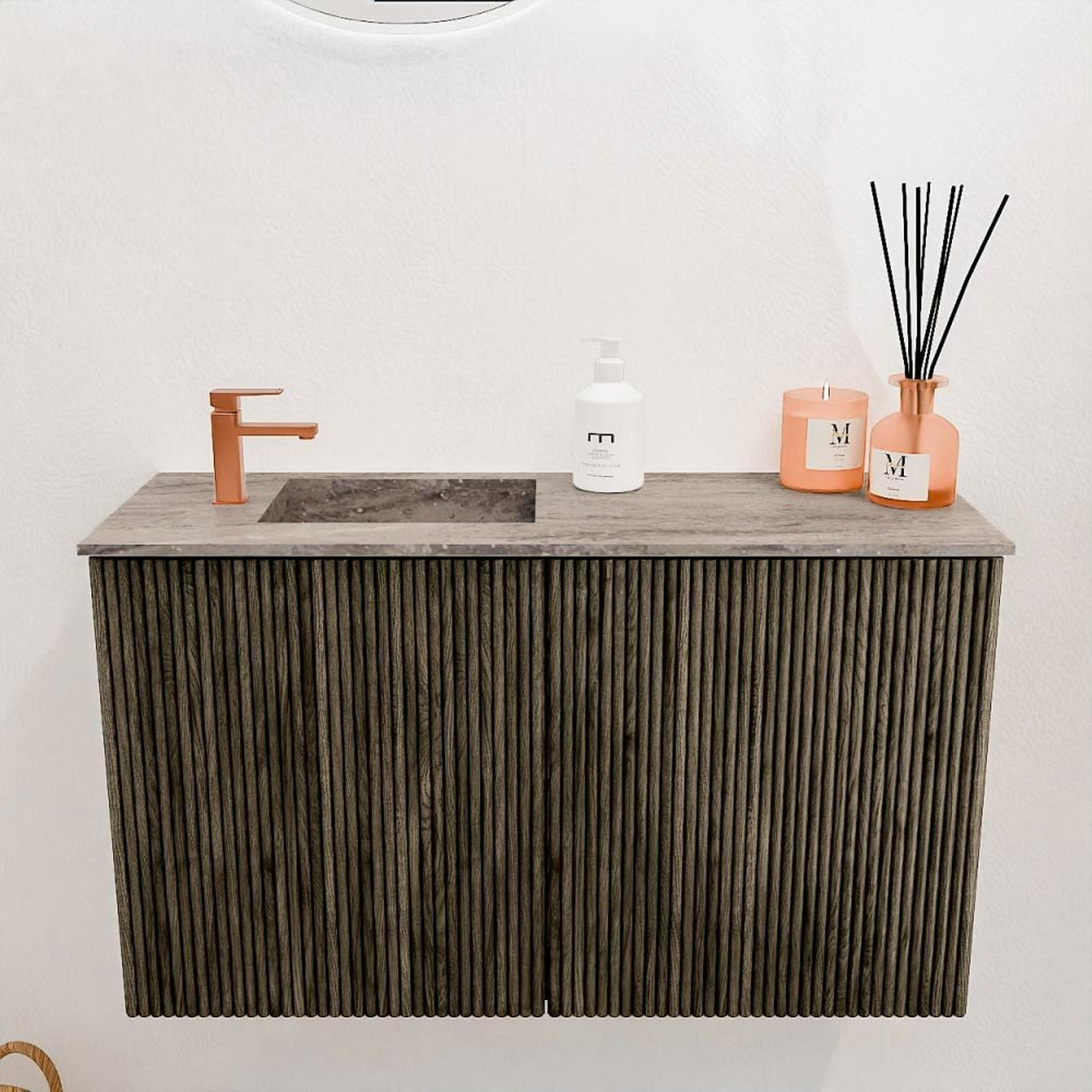 La couleur chaude Shadow et l'utilisation de chêne massif donnent à ce meuble une apparence naturelle et luxueuse. Les rainures verticales dans le bois apportent un détail subtil et moderne qui confère à l'ensemble un look raffiné. Ce meuble s'intègre facilement dans différents styles d'intérieur, du classique au contemporain. Grâce à la finition de haute qualité, le meuble reste beau longtemps et conserve son caractère, ce qui fait que votre salle de bains a toujours l'air soignée. Vous créez ainsi un espace élégant dont vous êtes fier et qui impressionne vos invités.