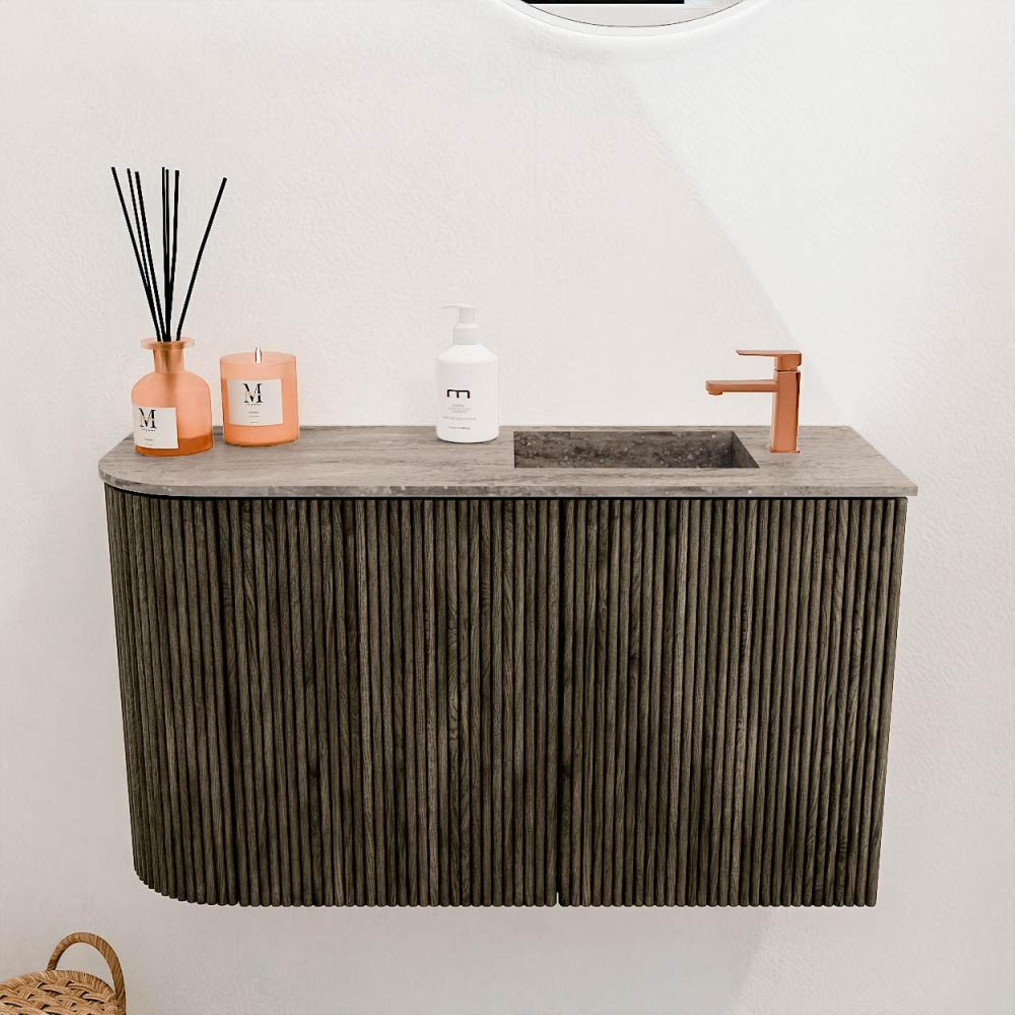 Le meuble se distingue immédiatement par son apparence raffinée et la structure à nervures verticales qui orne la façade. La couleur Shadow donne à l'ensemble une touche moderne mais chaleureuse qui se combine facilement avec d'autres accessoires de salle de bains. Cela fait de votre salle de bains un véritable point focal, sans être envahissant. Grâce au design subtil avec un coin arrondi à gauche, le meuble prend une forme unique et douce qui invite à la détente et au confort. Vous créez ainsi une atmosphère harmonieuse dans laquelle vous vous sentez bien chaque jour.