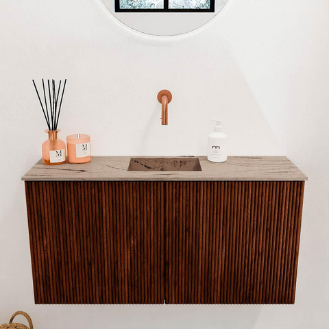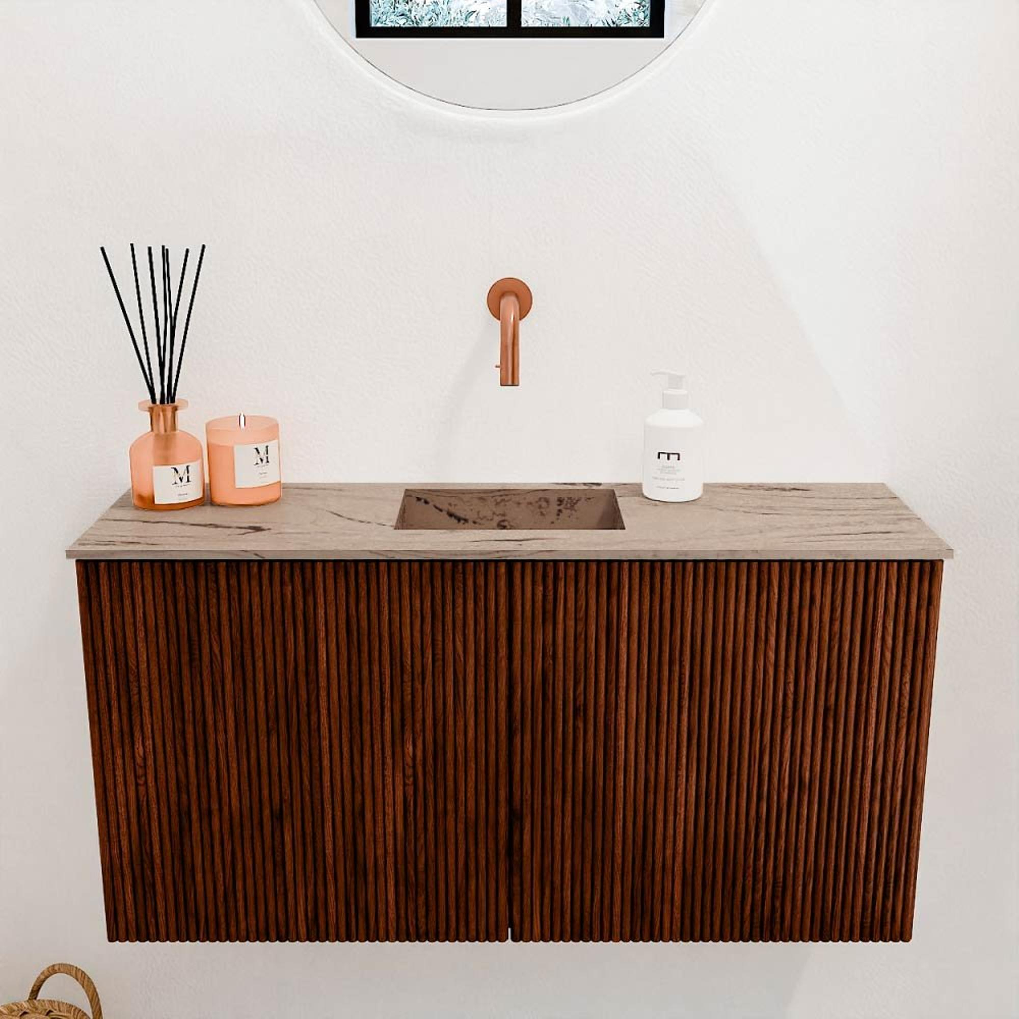 La couleur Ruby profonde du meuble donne immédiatement à votre salle de bains une ambiance chaleureuse et luxueuse. Ce meuble est conçu avec un souci du détail, où la combinaison de la couleur riche et du design épuré crée une élégance intemporelle. La vasque couleur Arena forme un contraste subtil qui garde l'ensemble frais et moderne. Ainsi, vous créez une salle de bains qui est non seulement fonctionnelle, mais aussi visuellement attrayante. Grâce à la fixation murale, l'espace paraît en outre plus spacieux et ordonné, ce qui contribue à une atmosphère détendue.