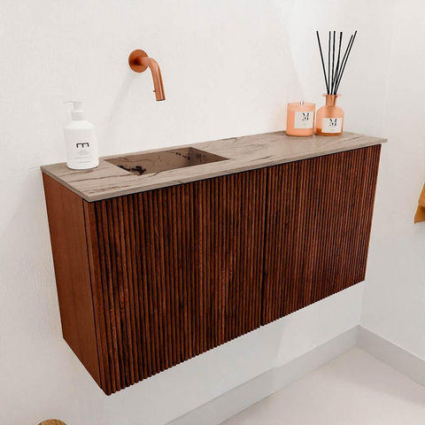 Ce meuble se distingue immédiatement par son apparence raffinée. La couleur Ruby profonde du chêne massif apporte chaleur et caractère à votre salle de bains. Les rainures verticales du meuble ajoutent un détail subtil et moderne qui rend le design encore plus élégant. La vasque dans la douce couleur Arena forme un magnifique contraste et ajoute une touche de fraîcheur. Vous obtenez ainsi un meuble qui n'est pas seulement fonctionnel, mais aussi un véritable élément décoratif qui donne à votre salle de bains une allure exclusive.