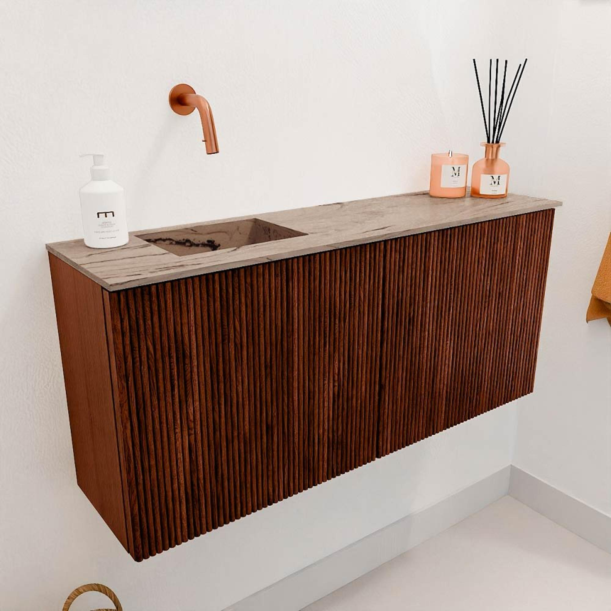 Avec sa couleur rubis profonde et les rainures verticales sur les façades, ce meuble dégage une pure élégance. La combinaison de chêne massif à l'avant et de placage chêne sur les côtés offre un aspect naturel et chaleureux qui s'intègre facilement dans divers styles d'intérieur. Ce meuble n'est pas simplement un élément fonctionnel, mais une déclaration de style qui confère à votre salle de bains une ambiance unique et luxueuse. La couleur subtile Arena de la vasque crée un magnifique contraste qui attire l'attention sans dominer.