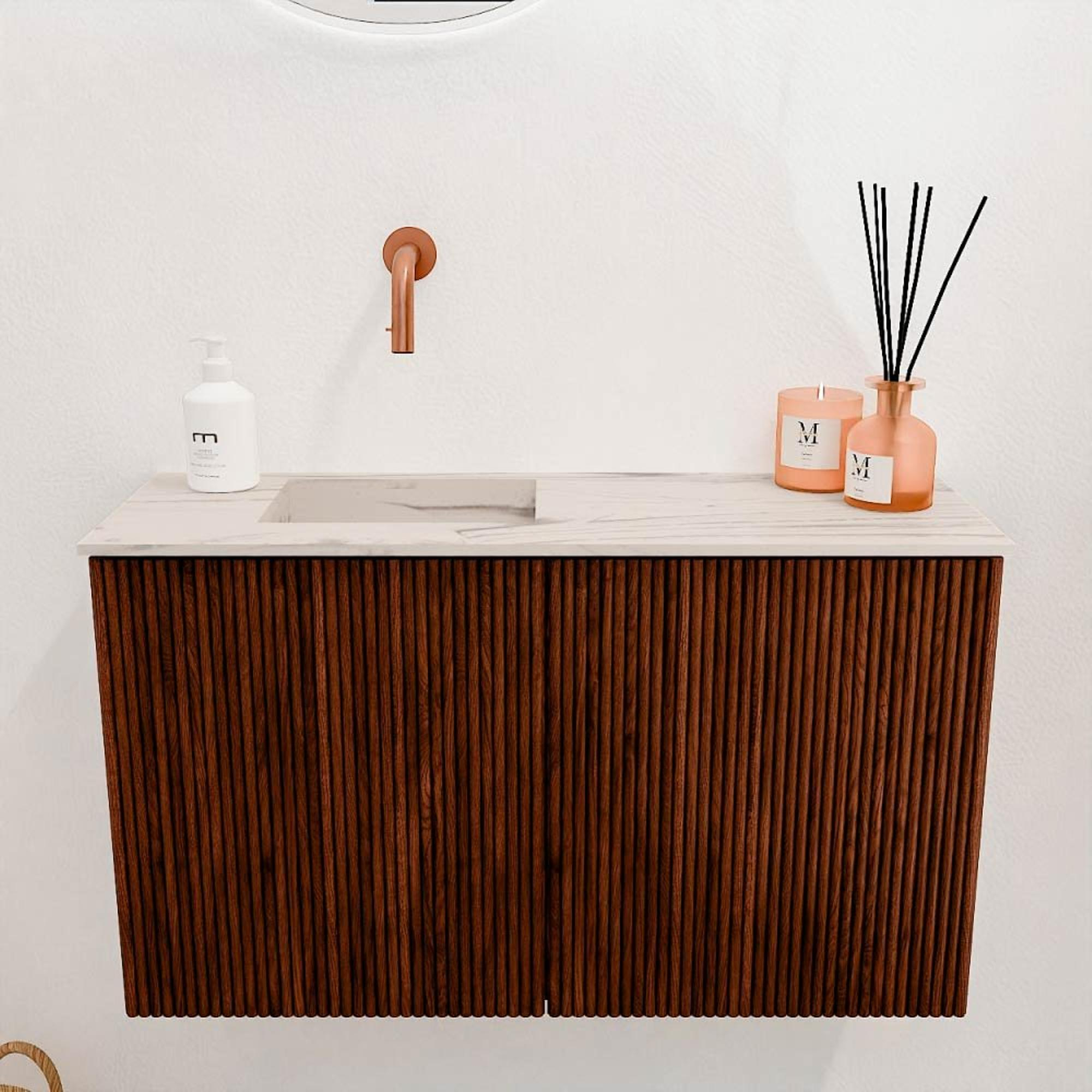 Transformez votre salle de bains ou toilettes d'invités avec ce magnifique meuble qui combine style et fonctionnalité sans effort. Le design compact s'adapte parfaitement aux petits espaces, tandis que la couleur chaude Ruby apporte une ambiance chaleureuse et accueillante. Grâce à la structure verticale rainurée sur les façades, le meuble acquiert un charme naturel unique qui attire immédiatement l'attention. La combinaison de chêne massif et de placage chêne assure non seulement une apparence haut de gamme, mais aussi une longue durée de vie. La vasque, stratégiquement placée à gauche, offre suffisamment d'espace pour effectuer votre routine quotidienne confortablement. Sans trou de robinet, vous pouvez choisir vous-même le robinet qui correspond le mieux à votre style et à vos souhaits. Ce meuble complète votre salle de bains et vous procure chaque jour cette sensation de luxe et de calme.