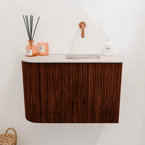 Avec ses rainures verticales et la chaude couleur Ruby, ce meuble dégage une pure élégance. La combinaison du chêne massif pour les façades et du placage chêne sur les côtés assure une apparence exclusive qui donne immédiatement un aspect luxueux à votre salle de bains. L'arrondi subtil sur le côté gauche rend le design unique et crée une forme douce et accueillante qui s'intègre parfaitement dans les salles de bains modernes et classiques. Vous créez ainsi un espace qui est non seulement fonctionnel, mais aussi visuellement attrayant.