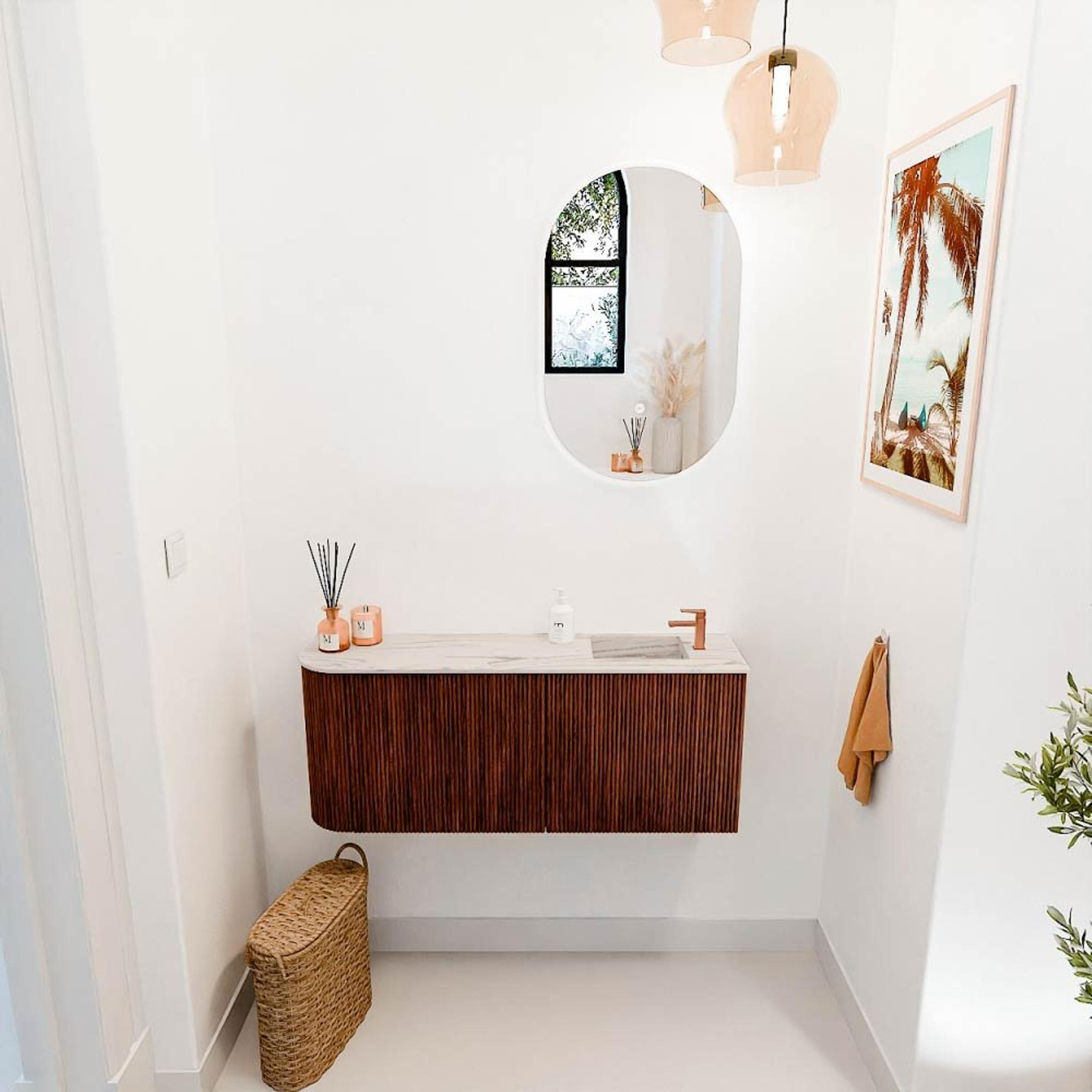 La couleur Ruby frappante du meuble donne immédiatement à votre salle de bains une apparence chaleureuse et accueillante. La forme arrondie sur le côté gauche crée un accent ludique et moderne, ce qui distingue le meuble des meubles de salle de bains standards. La vasque en couleur Nata avec un trou de robinet à droite ajoute un contraste subtil qui attire l'attention sans dominer. Tout cela fait du meuble un véritable point focal qui s'intègre facilement dans divers styles d'intérieur, du moderne au classique. Ainsi, vous profitez non seulement de la fonctionnalité, mais aussi d'une salle de bains qui est magnifique.