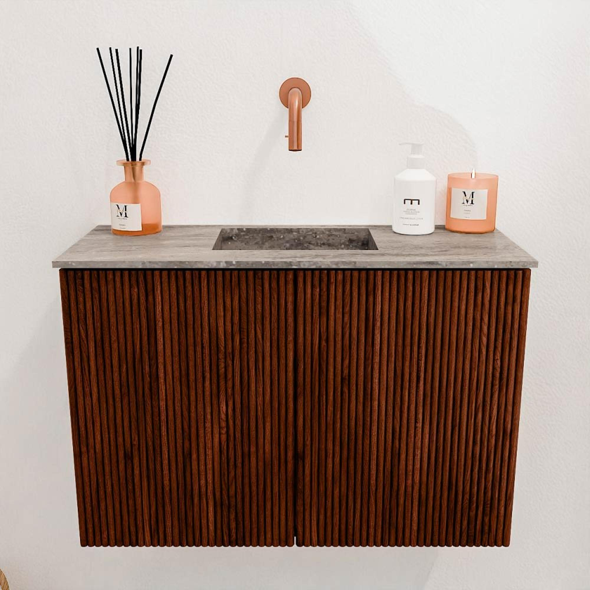 Ce meuble dégage une pure élégance grâce à l'utilisation de chêne massif et à la finition chaude Ruby. Les rainures verticales sur la façade apportent un détail subtil mais distinctif qui donne un aspect moderne à l'ensemble. Par la combinaison de matériaux naturels et d'un design épuré, le meuble s'intègre facilement dans divers styles d'intérieur, du classique au moderne. Ainsi, vous créez des toilettes qui ne sont pas seulement fonctionnelles, mais aussi un véritable point de mire. La position centrale de la vasque souligne la symétrie et le calme dans le design, contribuant à une atmosphère harmonieuse.