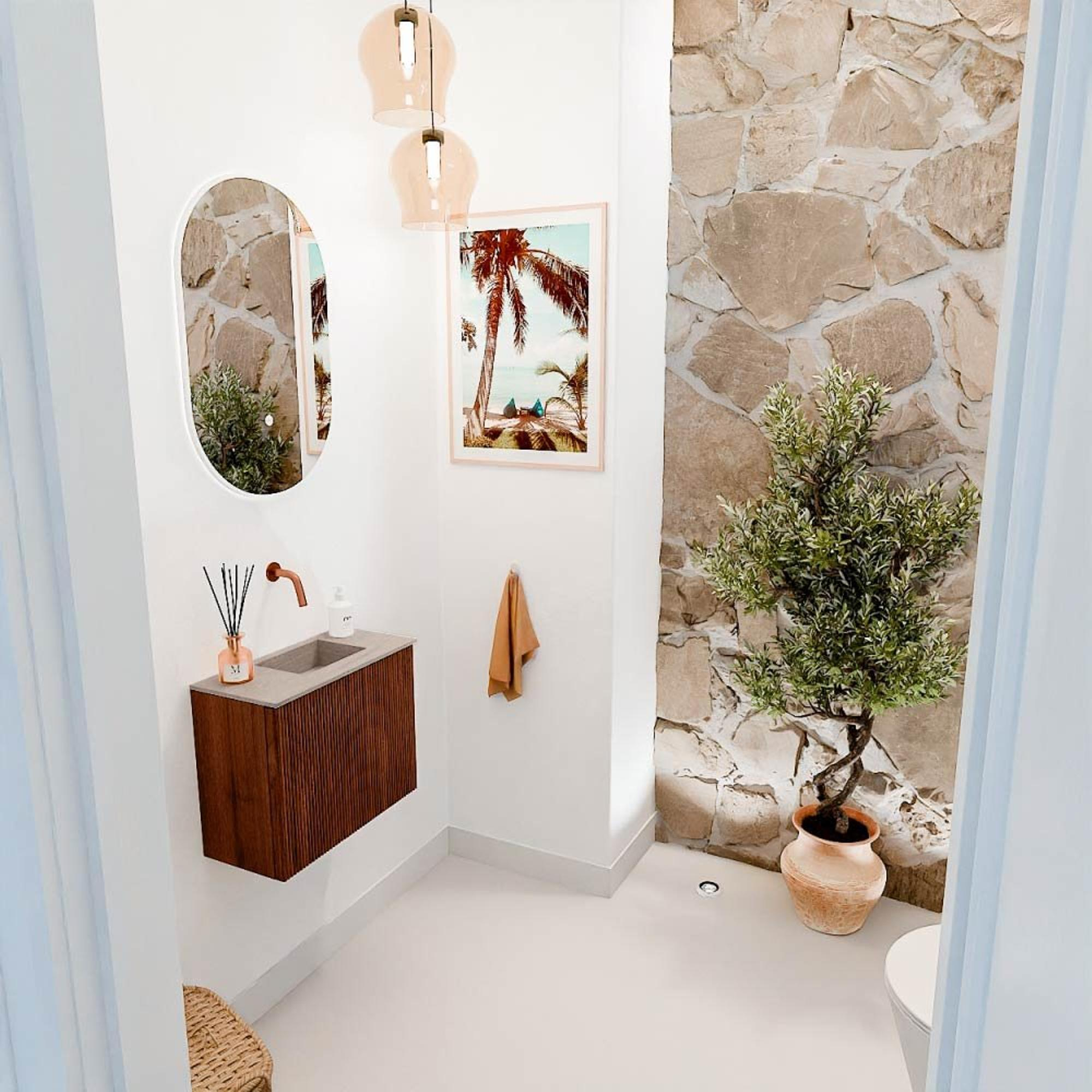 Avec ce meuble compact, vous donnez immédiatement une touche élégante à vos toilettes invités ou à une petite salle de bains. Il combine une apparence raffinée avec une fonctionnalité intelligente, ce qui permet d’optimiser l’espace sans compromettre le design. La couleur chaude Ruby associée à la vasque subtile Saba crée une ambiance harmonieuse dans laquelle vous commencez chaque jour avec plaisir. Grâce à ses dimensions réfléchies, le meuble s’adapte parfaitement aux petits espaces, tandis que les matériaux et la finition de haute qualité dégagent une sensation de luxe et de durabilité. Ainsi, vous transformez facilement votre salle de bains en un lieu où confort et élégance se rencontrent.